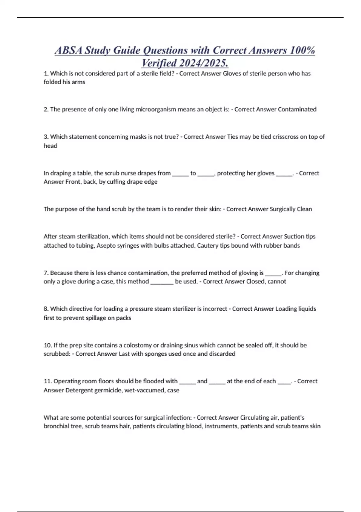 ABSA Study Guide Questions with Correct Answers 100% Verified 2024/2025. 1. Which is not considered part of a sterile field? - Correct Answer Gloves of sterile person who has folded his arms 2. The presence of only one living microorganism means an object is: - Correct Answer Contaminated 3. Which statement concerning masks is not true? - Correct Answer Ties may be tied crisscross on top of head In draping a table, the scrub nurse drapes from _____ to _____, protecting her gloves _____. - Correct Answer Front, back, by cuffing drape edge The purpose of the hand scrub by the team is to render their skin: - Correct Answer Surgically Clean After steam sterilization, which items should not be considered sterile? - Correct Answer Suction tips attached to tubing, Asepto syringes with bulbs attached, Cautery tips bound with rubber bands 7. Because there is less chance contamination, the preferred method of gloving is _____. For changing only a glove during a case, this method _______ be used. - Correct Answer Closed, cannot 8. Which directive for loading a pressure steam sterilizer is incorrect - Correct Answer Loading liquids first to prevent spillage on packs 10. If the prep site contains a colostomy or draining sinus which cannot be sealed off, it should be scrubbed: - Correct Answer Last with sponges used once and discarded