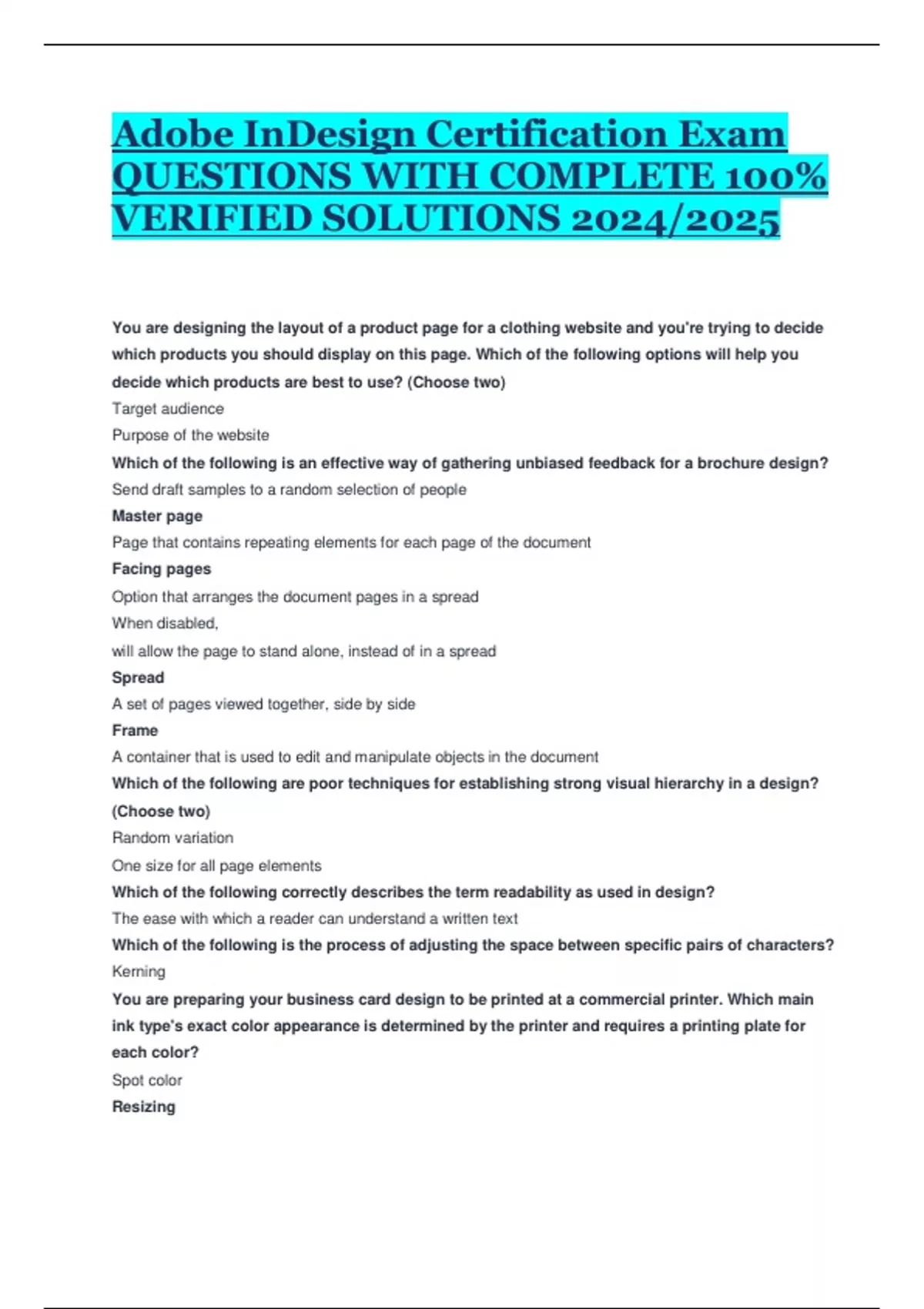 Adobe InDesign Certification Exam QUESTIONS WITH COMPLETE 100% VERIFIED SOLUTIONS 2024/2025