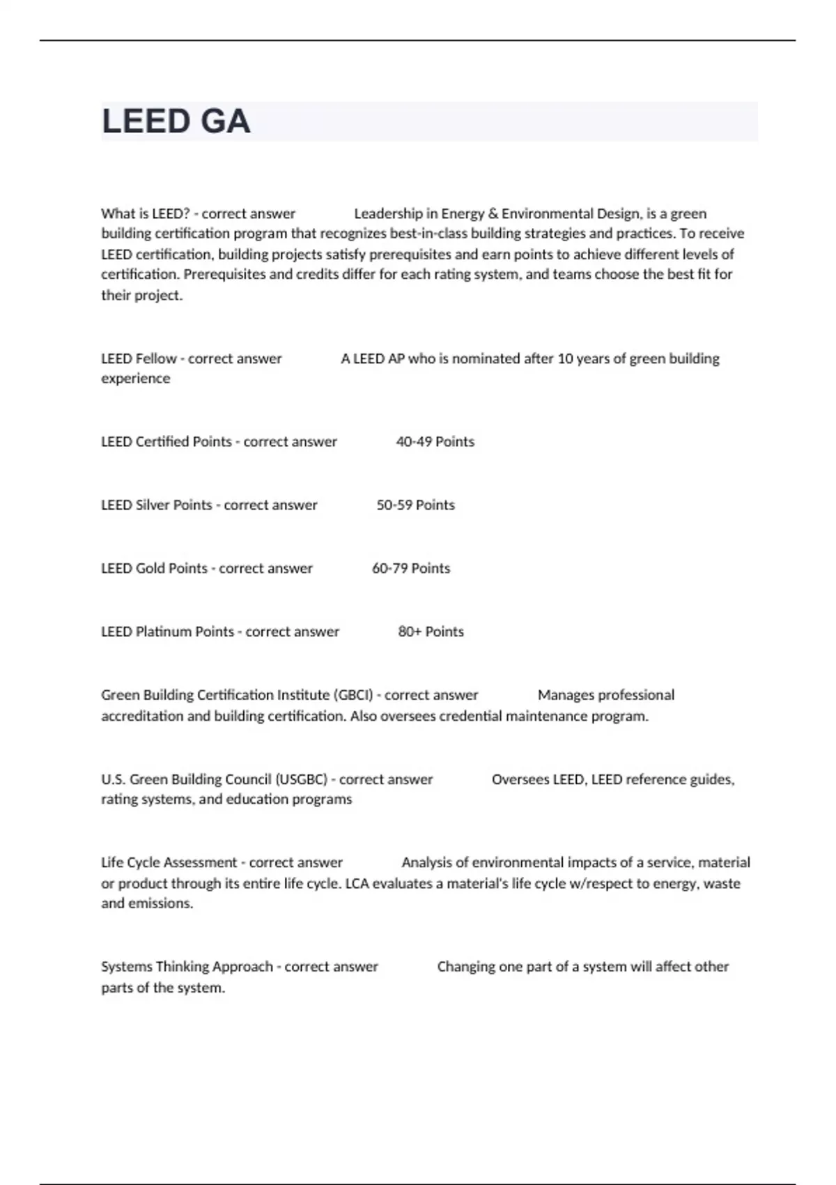 What is LEED? - correct answer Leadership in Energy & Environmental Design, is a green building certification program that recognizes best-in-class building strategies and practices. To receive LEED certification, building projects satisfy prerequisites and earn points to achieve different levels of certification. Prerequisites and credits differ for each rating system, and teams choose the best fit for their project. LEED Fellow - correct answer A LEED AP who is nominated after 10 years of green building experience LEED Certified Points - correct answer 40-49 Points LEED Silver Points - correct answer 50-59 Points LEED Gold Points - correct answer 60-79 Points LEED Platinum Points - correct answer 80+ Points Green Building Certification Institute (GBCI) - correct answer Manages professional accreditation and building certification. Also oversees credential maintenance program. U.S. Green Building Council (USGBC) - correct answer Oversees LEED, LEED reference guides, rating systems, and education programs Life Cycle Assessment - correct answer Analysis of environmental impacts of a service, material or product through its entire life cycle. LCA evaluates a material's life cycle w/respect to energy, waste and emissions. Systems Thinking Approach - correct answer Changing one part of a system will affect other parts of the system. Triple Bottom Line - correct answer Green building evaluation is based on their TBL. People (social), Planet (environment) and profit (economic) Black Water - correct answer Water from toilets, urinals, kitchen sinks and dishwashers Grey Water - correct answer untreated house-hold waste water which has not come in contact with toilet waste or kitchen sinks . Water from bathroom and laundry sinks, tubs, showers and washers. Energy and Atmosphere-Green Power - correct answer Encourages the development and use of renewable sourced energy from the grid. You must purchase 35% of the building's energy consumption for at least 2 years. Based on the percentage of a building's energy consumption Energy and Atmosphere-Onsite Renewable Energy - correct answer Based on the percent of building's annual energy cost Life Cycle Costing - correct answer Evaluation of the economic performance of a product over its useful life These factors are considered when calculating LCC: A. Operating Costs B. Maintenance Costs C. Initial Costs D. Life Span Property Area - correct answer Total area within the legal property boundaries of the site Adaptive Reuse - correct answer The design and construction of a building so that it can serve a future use that is different that its current use -Water Efficiency-Water Efficient Landscaping Strategies - correct answer - Install native or adaptive landscaping to reduce or eliminate irrigation demands. - Apply xeriscaping concept which is a thorough landscaping concept that requires little or no Irrigation - Use mulching retain moisture and prevent evaporation of the plant's water - Reduce or eliminate turf grasses - Use efficient irrigation systems such as Drip irrigation systems or micro-misters - Use nonpotable water for irrigation such as captured rainwater, graywater or municipally claimed waste water - Install submeters to monitor consumption Floor Score - correct answer Low VOC certification for hard surface flooring Green Seal Standard - correct answer VOC limits on commercial adhesives and paints Green Label - correct answer Measure of low VOC carpet cushions and adhesives to help with IAQ Green Label Plus - correct answer Measure of low VOC carpets to help w/ IAQ ANSI/ASHRAE 55-2004 - correct answer Addresses thermal comfort ASHRAE 52.2-1999 - correct answer Indoor Air Quality Management and Indoor Pollutant + Source Control ASHRAE 62.1-2007 - correct answer Minimum Indoor Air Quality and increased ventilation Forest Stewardship Council (FSC) - correct answer Certified Wood-A chain of custody (COC) certificate is required if using this for the Rapidly Renewable Materials credit. All permanent installed wood based products can be included in the Certified Wood credit. International Organization for Standardization (ISO) - correct answer defines pre-consumer and post consumer recycled content Montreal Protocol - correct answer Fundamental and enhanced refrigerant management--International Protocol to reduce ozone depletion. CFCs were to be phased out in 2010, HCFCs in 2030 Green-e - correct answer Green Energy--voluntary certification and verification program for renewable energy products ANSI/ASHRAE/IESNA 90.1-2007 - correct answer Energy Performance including light pollution Environmental Protection Agency (EPA) - correct answer Construction pollution prevention, brown field development Energy Policy Act - correct answer Water use reduction IPC/UPC 2006 - correct answer Water technologies--provides the baseline flow rate for commercial faucets WaterSense - correct answer Third Part Certification of water efficient fixtures--fixtures which uses the least amount of potable water Smart Growth - correct answer Urban Planning Theory: -Protection of undeveloped land -transit and bike friendly to reduce cars -mixed use development -compact urban centers -walkable neighborhoods LEED Certification Process - correct answer 1. Prepare Application 2. Submit Application 3. Application Review (split or combined) 4. Appeals 5. Certification Minimum Program Requirements - correct answer 1. Comply w/environmental laws 2. Complete permanent space or building 3. Reasonable site boundary (no gerrymandering) 4. Minimum floor area requirements 5. Minimum occupancy rate of 1 person at some point during a year 6. Share whole building and energy use data 7. Minimum area to site ratio Minimum Program Requirements Goals - correct answer 1. To give clear guidance to the customer 2. To protect the integrity of the LEED program 3. To reduce complications that occur during the LEED certification process LEED Credit Categories - correct answer 1. Sustainable Sites 2. Wate