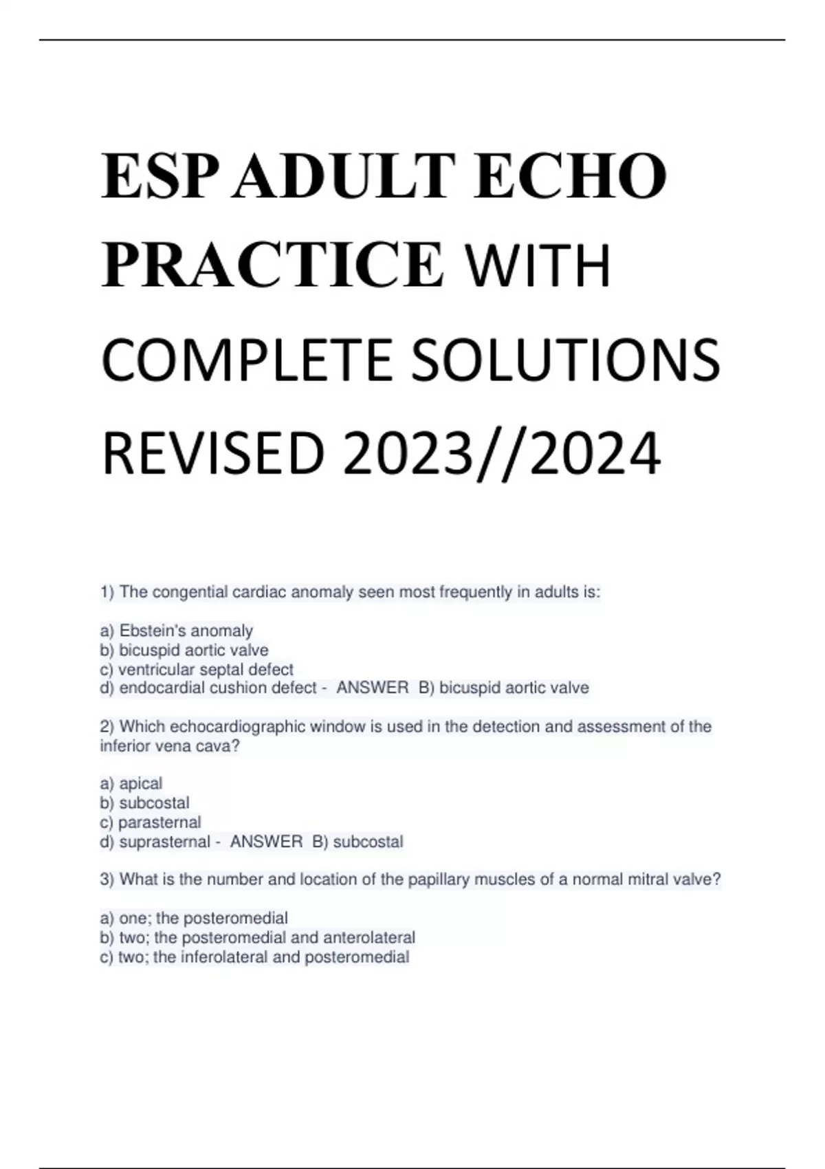 ESP ADULT ECHO PRACTICE WITH COMPLETE SOLUTIONS REVISED 2023//2024 1) The congential cardiac anomaly seen most frequently in adults is: a) Ebstein's anomaly b) bicuspid aortic valve c) ventricular septal defect d) endocardial cushion defect - ANSWER B) bicuspid aortic valve 2) Which echocardiographic window is used in the detection and assessment of the inferior vena cava? a) apical b) subcostal c) parasternal d) suprasternal - ANSWER B) subcostal 3) What is the number and location of the papillary muscles of a normal mitral valve? a) one; the posteromedial b) two; the posteromedial and anterolateral c) two; the inferolateral and posteromedial d) three; the anterolateral, posteromedial, and inferolateral - ANSWER B) two; the inferolateral and anterolateral 4) Clinically, prolapse of the mitral valve is associated with: a) opening snap and systolic murmur b) diastolic murmur and third heart sound c) fixed splitting of the second heart sound d) midsystolic click and / or late systolic murmur - ANSWER D) midsystolic click and/or late systolic murmur 5) Papillary muscle dysfunction usually results from: a) Dressler's syndrome b) ischemic heart disease c) bacterial endocarditis d) rheumatic heart disease - ANSWER B) ischemic heart disease 6) In order to record the vegetation's of endocarditis by echocardiography, the vegetation's must have a diameter of at least: a) one centimeter b) three millimeters c) there centimeters d) five millimeters - ANSWER B) three millimeters 7) How many veins connect the pulmonary vascular bred with the left atrium in the normal heart? a) one b) two c) three d) four - ANSWER D) four 8) Which M-mode finding is considered to be a specific indicator of a fenestrated aortic valve? a) diastolic flutter of the mitral valve b) premature opening of the aortic valve c) diastolic flutter of the aortic valve d) early systolic closure of the aortic valve - ANSWER C) diastolic flutter of the aortic valve 9) Which cardiac abnormalities are frequently noted on the echocardiogram of patients with Marfan's syndrome? a) mitral stenosis and pericardial effusion b) mitral valve prolapse and aortic dilatation c) left ventricular aneurysm and thrombus d) dilatation of the pulmonary artery and pulmonic stenosis - ANSWER B) mitral valve prolapse and aortic dilatation 10) Which term is used to describe a segment of ventricular wall that exhibits no motion? a) akinesis b) dyskinesis c) hypokinesis d) hyperkinesis - ANSWER A) akinesis 11) A true aneurysm of the left ventricule can usually be distinguished from a pseudoaneurysm because a pseud