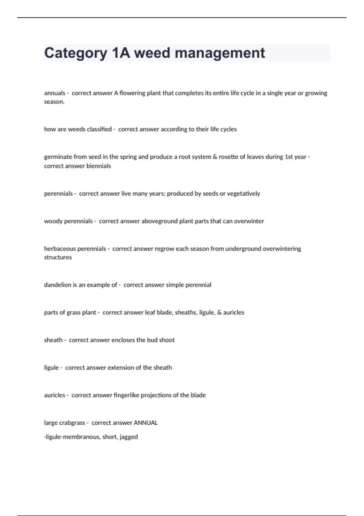 Category 1A weed management annuals - correct answer A flowering plant that completes its entire life cycle in a single year or growing season. how are weeds classified - correct answer according to their life cycles germinate from seed in the spring and produce a root system & rosette of leaves during 1st year - correct answer biennials perennials - correct answer live many years; produced by seeds or vegetatively woody perennials - correct answer aboveground plant parts that can overwinter herbaceous perennials - correct answer regrow each season from underground overwintering structures dandelion is an example of - correct answer simple perennial parts of grass plant - correct answer leaf blade, sheaths, ligule, & auricles sheath - correct answer encloses the bud shoot ligule - correct answer extension of the sheath auricles - correct answer fingerlike projections of the blade large crabgrass - correct answer ANNUAL -ligule-membranous, short, jagged -blade-broad, pointed & hairy