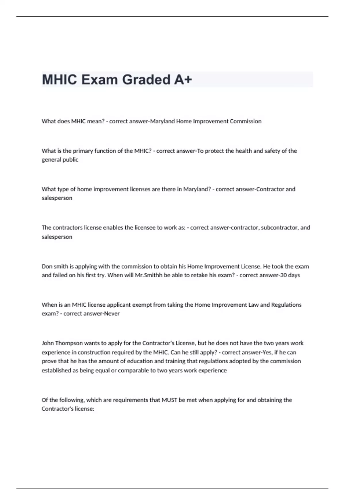 What does MHIC mean? - correct answer-Maryland Home Improvement Commission What is the primary function of the MHIC? - correct answer-To protect the health and safety of the general public What type of home improvement licenses are there in Maryland? - correct answer-Contractor and salesperson The contractors license enables the licensee to work as: - correct answer-contractor, subcontractor, and salesperson Don smith is applying with the commission to obtain his Home Improvement License. He took the exam and failed on his first try. When will Mr.Smithh be able to retake his exam? - correct answer-30 days When is an MHIC license applicant exempt from taking the Home Improvement Law and Regulations exam? - correct answer-Never John Thompson wants to apply for the Contractor's License, but he does not have the two years work experience in construction required by the MHIC. Can he still apply? - correct answer-Yes, if he can prove that he has the amount of education and training that regulations adopted by the commission established as being equal or comparable to two years work experience Of the following, which are requirements that MUST be met when applying for and obtaining the Contractor's license: