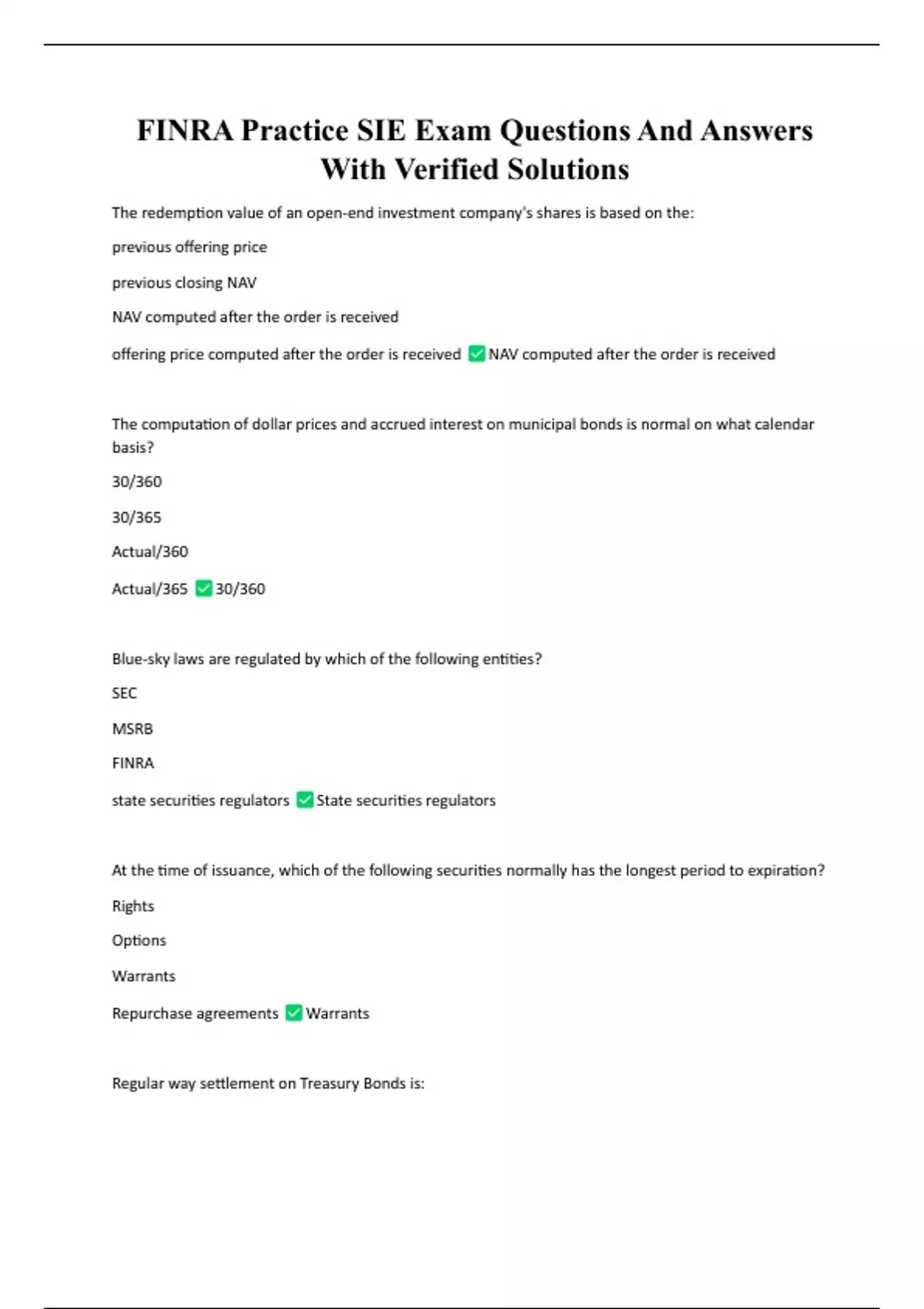 FINRA Practice SIE Exam Questions And Answers With Verified Solutions FINRA Practice SIE Exam Questions And Answers With Verified Solutions