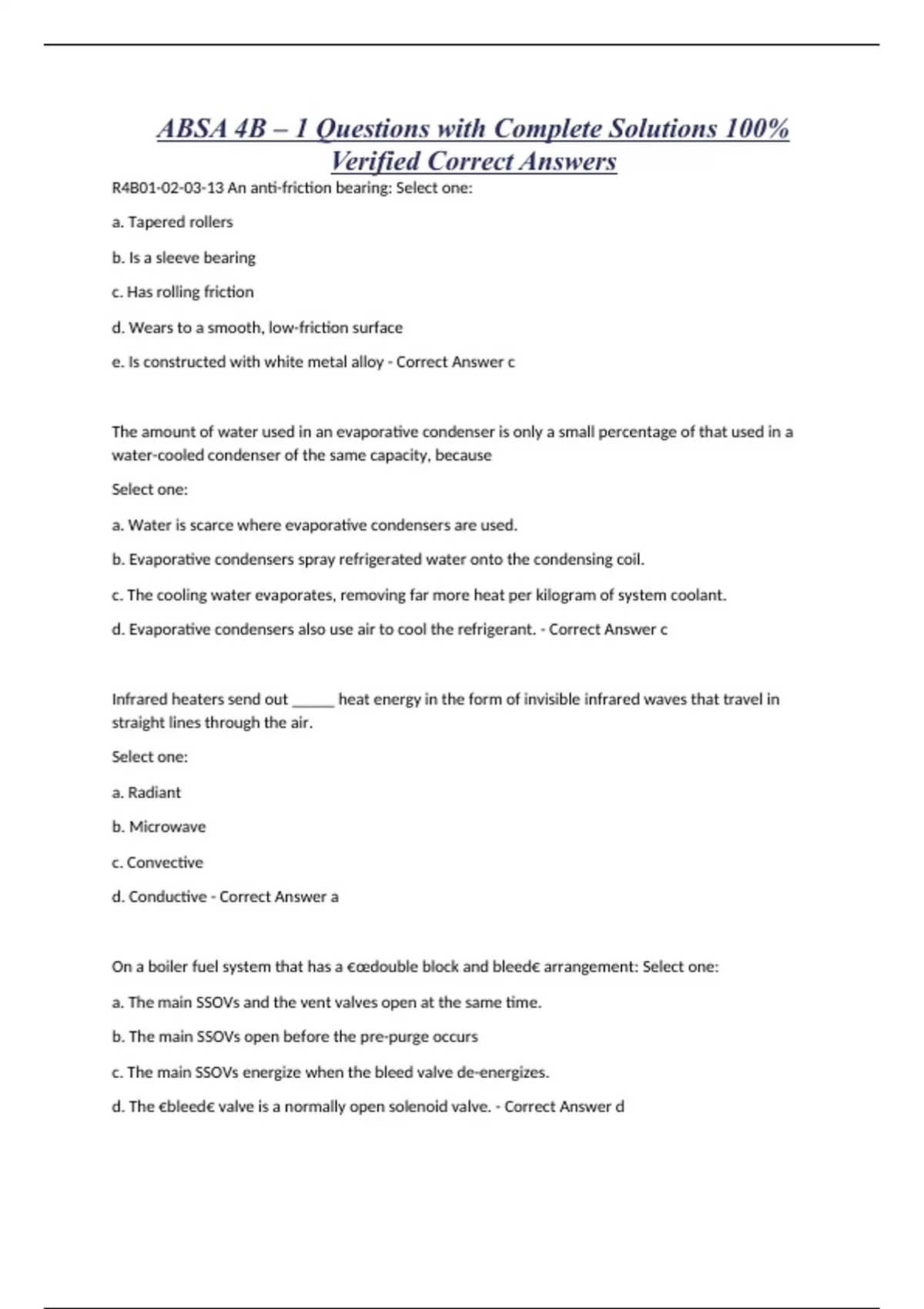 ABSA 4B – 1 Questions with Complete Solutions 100% Verified Correct Answers R4B An anti-friction bearing: Select one: a. Tapered rollers b. Is a sleeve bearing c. Has rolling friction d. Wears to a smooth, low-friction surface e. Is constructed with white metal alloy - Correct Answer c The amount of water used in an evaporative condenser is only a small percentage of that used in a water-cooled condenser of the same capacity, because Select one: a. Water is scarce where evaporative condensers are used. b. Evaporative condensers spray refrigerated water onto the condensing coil. c. The cooling water evaporates, removing far more heat per kilogram of system coolant. d. Evaporative condensers also use air to cool the refrigerant. - Correct Answer c Infrared heaters send out _____ heat energy in the form of invisible infrared waves that travel in straight lines through the air. Select one: a. Radiant b. Microwave c. Convective d. Conductive - Correct Answer a On a boiler fuel system that has a €œdouble block and bleed€ arrangement: Select one: a. The main SSOVs and the vent valves open at the same time. b. The main SSOVs open before the pre-purge occurs c. The main SSOVs energize when the bleed valve de-energizes. d. The €bleed€ valve is a normally open solenoid valve. - Correct Answer d In a centrifuga