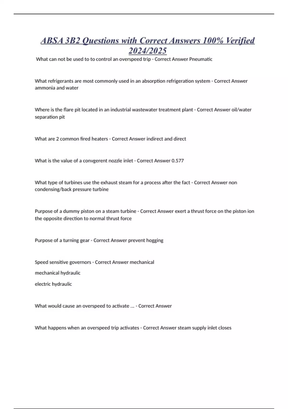 ABSA 3B2 Questions with Correct Answers 100% Verified 2024/2025 What can not be used to to control an overspeed trip - Correct Answer Pneumatic What refrigerants are most commonly used in an absorption refrigeration system - Correct Answer ammonia and water Where is the flare pit located in an industrial wastewater treatment plant - Correct Answer oil/water separation pit What are 2 common fired heaters - Correct Answer indirect and direct What is the value of a convgerent nozzle inlet - Correct Answer 0.577 What type of turbines use the exhaust steam for a process after the fact - Correct Answer non condensing/back pressure turbine Purpose of a dummy piston on a steam turbine - Correct Answer exert a thrust force on the piston ion the opposite direction to normal thrust force Purpose of a turning gear - Correct Answer prevent hogging Speed sensitive governors - Correct Answer mechanical mechanical hydraulic electric hydraulic What would cause an overspeed to activate ... - Correct Answer What happens when an overspeed trip activates - Correct Answer steam supply inlet closes