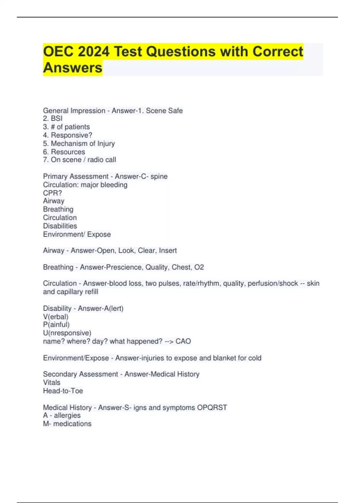 OEC 2024 Test Questions with Correct Answers General Impression - Answer-1. Scene Safe 2. BSI 3. # of patients 4. Responsive? 5. Mechanism of Injury 6. Resources 7. On scene / radio call Primary Assessment - Answer-C- spine Circulation: major bleeding CPR? Airway Breathing Circulation Disabilities Environment/ Expose Airway - Answer-Open, Look, Clear, Insert Breathing - Answer-Prescience, Quality, Chest, O2 Circulation - Answer-blood loss, two pulses, rate/rhythm, quality, perfusion/shock -- skin and capillary refill Disability - Answer-A(lert) V(erbal) P(ainful) U(nresponsive) name? where? day? what happened? --> CAO Environment/Expose - Answer-injuries to expose and blanket for cold Secondary Assessment - Answer-Medical History Vitals Head-to-Toe Medical History - Answer-S- igns and symptoms OPQRST A - allergies M- medications P- past medical history L - last oral intake E - events leading up to injury/illness/event OPQRST - Answer-Onset Palliation/Provocation -- what makes it better or worse? Quality -- what does it feel like? Radiating/Referred - does the pain stay in one place or radiate? Severity -- scale 0-10 Time changed since start? Types of O2 administrations - Answer-Nasal Cannula - 1-6 Non-rebreather mask - 15 BVM - 15 SAMPLE - Answer-Signs and Symptoms Allergies Medications Past Medical History Last Oral Intake Events leading up Flail chest - Answer-two or more fractured ribs paradoxical chest motion pneumothorax - Answer-air in the pleural space difficulty breathing decreased spO2 blood in the pleural space = hemothorax blood and air = hemopneumothorax