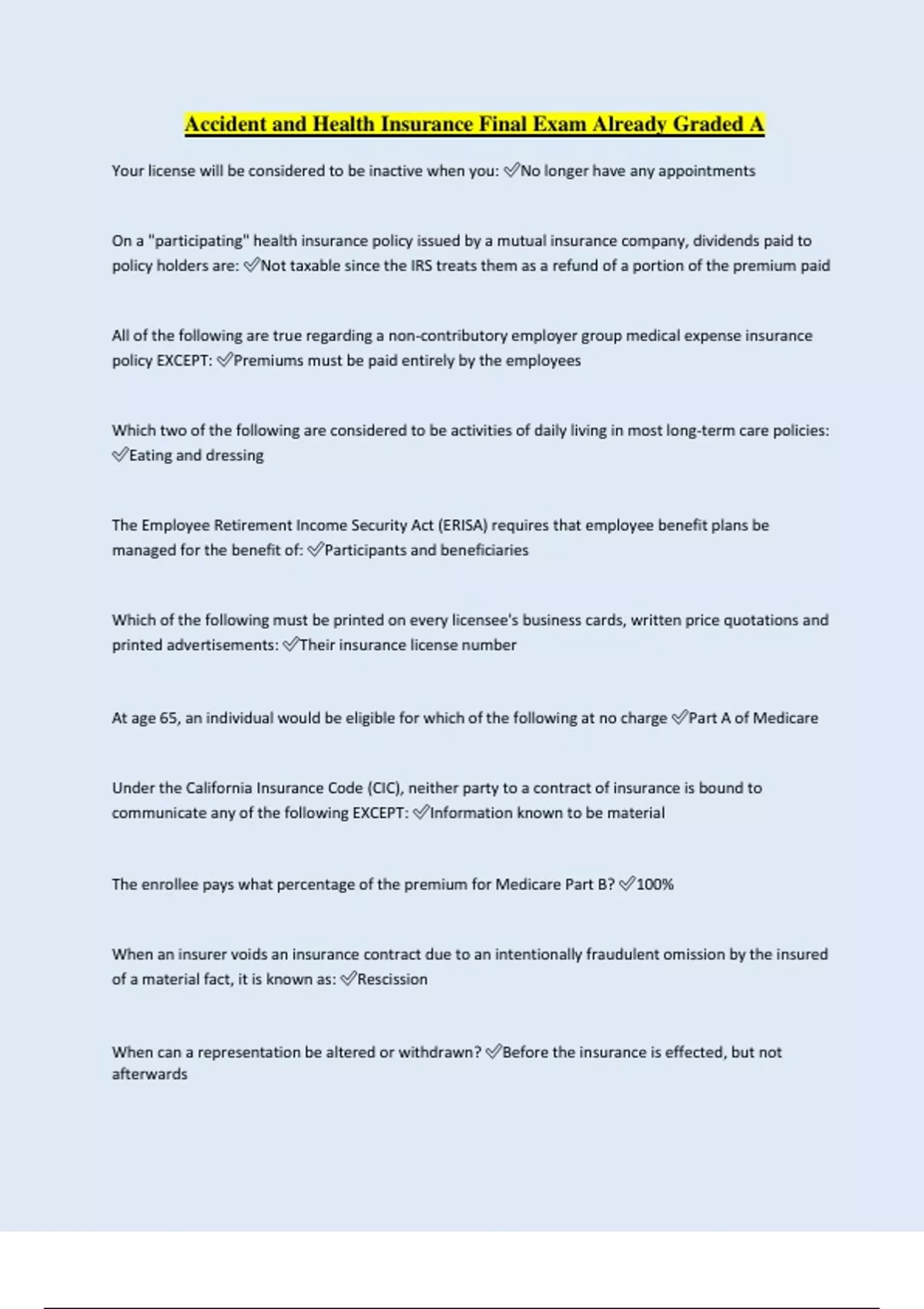 Accident and Health Insurance Final Exam Already Graded A Your license will be considered to be inactive when you: No longer have any appointments On a "participating" health insurance policy issued by a mutual insurance company, dividends paid to policy holders are: Not taxable since the IRS treats them as a refund of a portion of the premium paid All of the following are true regarding a non-contributory employer group medical expense insurance policy EXCEPT: Premiums must be paid entirely by the employees Which two of the following are considered to be activities of daily living in most long-term care policies: Eating and dressing The Employee Retirement Income Security Act (ERISA) requires that employee benefit plans be managed for the benefit of: Participants and beneficiaries Which of the following must be printed on every licensee's business cards, written price quotations and printed advertisements: Their insurance license number At age 65, an individual would be eligible for which of the following at no charge Part A of Medicare Under the California Insurance Code (CIC), neither party to a contract of insurance is bound to communicate any of the following EXCEPT: Information known to be material The enrollee pays what percentage of the premium for Medicare Part B? 100% When an insurer voids an insurance contract due to an intentionally fraudulent omission by the insured of a material fact, it is known as: Rescission When can a representation be altered or withdrawn? Before the insurance is effected, but not afterwards Under the Patient Protection and Affordable Care Act (PPACA), health plans cannot limit or deny benefits or deny coverage for a child younger than age ____ because the child has a pre-existing condition that developed before the child applied to join the plan: 19 Which of the following is not covered in a long-term care policy? Acute care in the hospital The uncertainty about loss that exists whenever more than one outcome is possible is called: Risk The hospice benefit under a long-term care policy will cover all of the following EXCEPT: Rehabilitation expenses On disability income insurance, another name for the "waiting" period is the _______ period: Elimination Which of the following parts of Medicare is known as the "managed care" option Part C - Medicare Advantage The Patient Protection and Affordable Care Act (PPACA) requires health plans to provide rebates to consumers for the amount of the premiums spent on clinical services and quality that is less than ____% for plans in the individual market place: 80 Medical expense insurance policies often contain a provision which states that during the first 12 months after the policy's effective date, there is no coverage for a pre-existing sickness that recurs. This provision is known as: A probationary period An applicant for health insurance completes an application, indicating that they have been treated for various medical conditions in the past. If the underwriter needs more information regarding these past treatments, they will most likely order a(n): Attending physicians statement Which of the following is true regarding the taxation of individual disability income policies? The premiums are not deductible and the benefits are tax free. HMOs try to contain costs by stressing: Preventive care Although a "fully insured" worker is entitled to retirement benefits under social security as early as age 62, they must be at least age ____ to automatically become eligible for Medicare: 65 An example of a fiduciary duty is: The trust that your client places in you in regard to handling premiums All of the following are parts of Medicare EXCEPT; Part D - Medi-Cal To attain "fully insured" status under social security, an individual must have worked and contributed to social security for at least ____ calendar quarters 40 Regarding surviving spouse benefits under social security, the time interval between the date survivor benefits end and the date benefits resume is known as the _________ period: Blackout A worker must have "fully insured" status under social security to qualify for all of the following benefits EXCEPT: Survivors In order to be considered to be "totally disabled' under social security's definition, an individual must