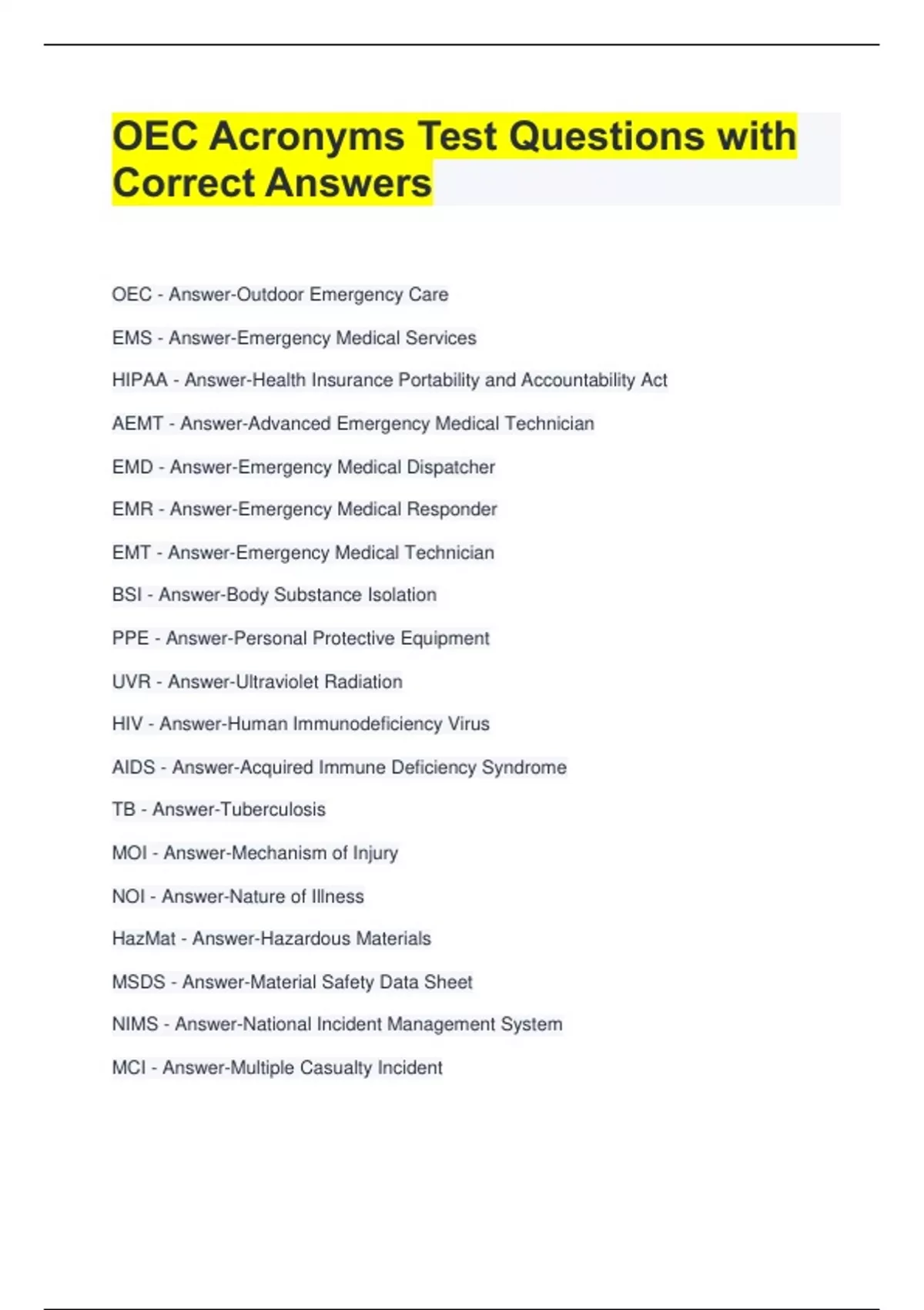 OEC Acronyms Test Questions with Correct Answers OEC - Answer-Outdoor Emergency Care EMS - Answer-Emergency Medical Services HIPAA - Answer-Health Insurance Portability and Accountability Act AEMT - Answer-Advanced Emergency Medical Technician EMD - Answer-Emergency Medical Dispatcher EMR - Answer-Emergency Medical Responder EMT - Answer-Emergency Medical Technician BSI - Answer-Body Substance Isolation PPE - Answer-Personal Protective Equipment UVR - Answer-Ultraviolet Radiation HIV - Answer-Human Immunodeficiency Virus AIDS - Answer-Acquired Immune Deficiency Syndrome TB - Answer-Tuberculosis MOI - Answer-Mechanism of Injury NOI - Answer-Nature of Illness HazMat - Answer-Hazardous Materials MSDS - Answer-Material Safety Data Sheet NIMS - Answer-National Incident Management System MCI - Answer-Multiple Casualty Incident ICS - Answer-Incident Command System IC - Answer-Incident Commander ICP (ch4) - Answer-Incident Command Post IAP - Answer-Incident Action Plan