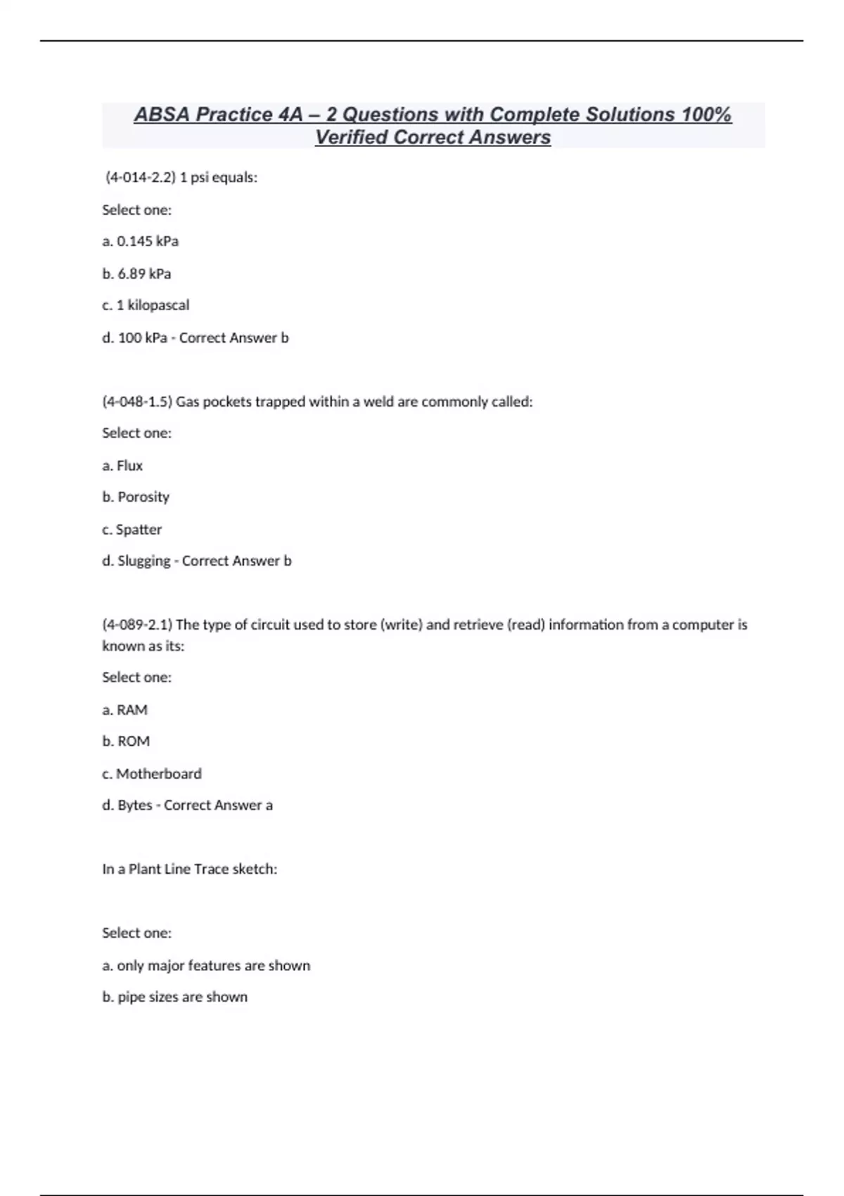 ABSA Practice 4A – 2 Questions with Complete Solutions 100% Verified Correct Answers (4-014-2.2) 1 psi equals: Select one: a. 0.145 kPa b. 6.89 kPa c. 1 kilopascal d. 100 kPa - Correct Answer b (4-048-1.5) Gas pockets trapped within a weld are commonly called: Select one: a. Flux b. Porosity c. Spatter d. Slugging - Correct Answer b (4-089-2.1) The type of circuit used to store (write) and retrieve (read) information from a computer is known as its: Select one: a. RAM b. ROM c. Motherboard d. Bytes - Correct Answer a In a Plant Line Trace sketch: Select one: a. only major features are shown b. pipe sizes are shown c. All process flows are shown d. All valves are shown - Correct Answer a One of the key components of a maintenance management system is: Select one: a. Keeping the budget a secret so people don't spend money b. Ensuring the talk button is not held down c. An inventory program d. Emergency shutdowns - Correct Answer c In general, all Acts will have the all of the following in common except: Select one: a. There will be a list of penalties, which could be levied for complying with the Act or Regulations b. A listing of the Codes and standards that have been adopted for use c. The responsibility and delegated authority of the Authorized