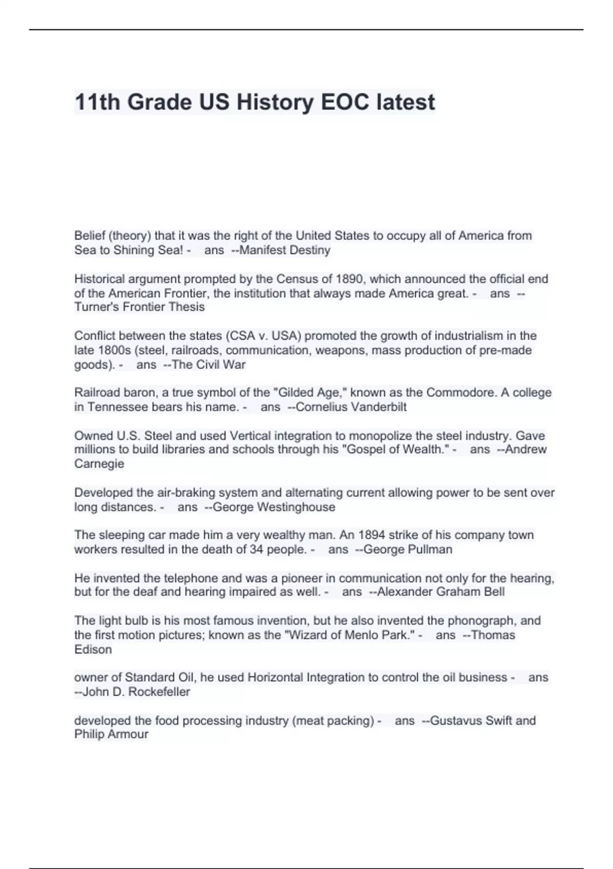 Belief (theory) that it was the right of the United States to occupy all of America from Sea to Shining Sea! - ans --Manifest Destiny Historical argument prompted by the Census of 1890, which announced the official end of the American Frontier, the institution that always made America great. - ans --Turner's Frontier Thesis Conflict between the states (CSA v. USA) promoted the growth of industrialism in the late 1800s (steel, railroads, communication, weapons, mass production of pre-made goods). - ans --The Civil War Railroad baron, a true symbol of the "Gilded Age," known as the Commodore. A college in Tennessee bears his name. - ans --Cornelius Vanderbilt Owned U.S. Steel and used Vertical integration to monopolize the steel industry. Gave millions to build libraries and schools through his "Gospel of Wealth." - ans --Andrew Carnegie Developed the air-braking system and alternating current allowing power to be sent over long distances. - ans --George Westinghouse The sleeping car made him a very wealthy man. An 1894 strike of his company town workers resulted in the death of 34 people. - ans --George Pullman He invented the telephone and was a pioneer in communication not only for the hearing, but for the deaf and hearing impaired as well. - ans --Alexander Graham Bell The light bulb is his most famous invention, but he also invented the phonograph, and the first motion pictures; known as the "Wizard of Menlo Park." - ans --Thomas Edison owner of Standard Oil, he used Horizontal Integration to control the oil business - ans --John D. Rockefeller developed the food processing industry (meat packing) - ans --Gustavus Swift and Philip Armour