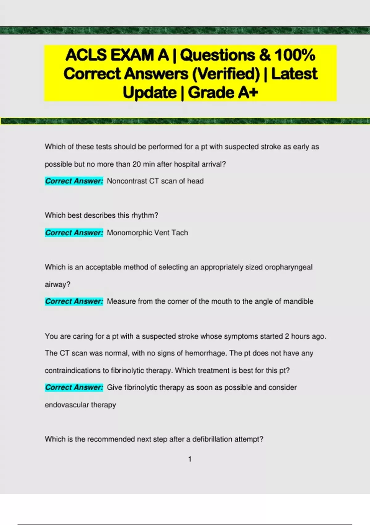 ACLS EXAM A | Questions & 100% Correct Answers (Verified) | Latest Update | Grade A+