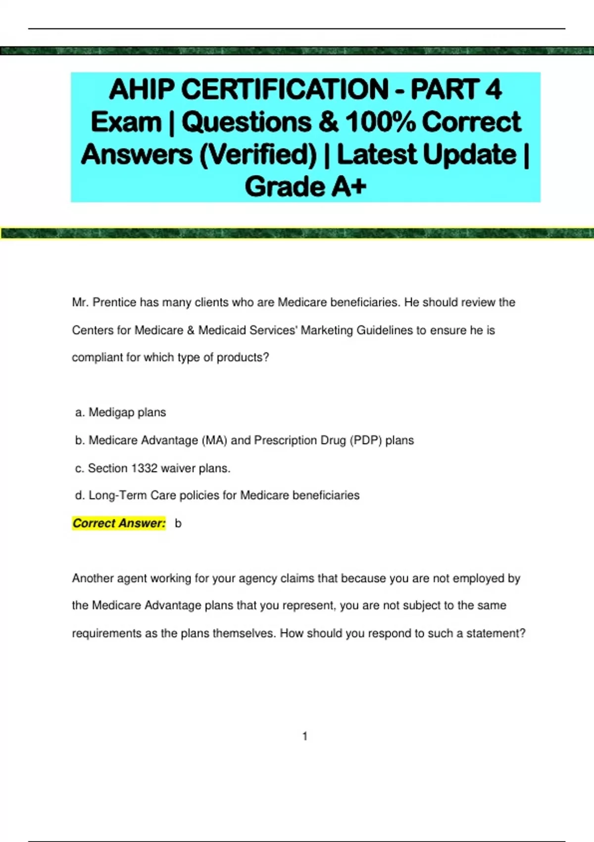 AHIP CERTIFICATION - PART 4 Exam | Questions & 100% Correct Answers (Verified) | Latest Update | Grade A+