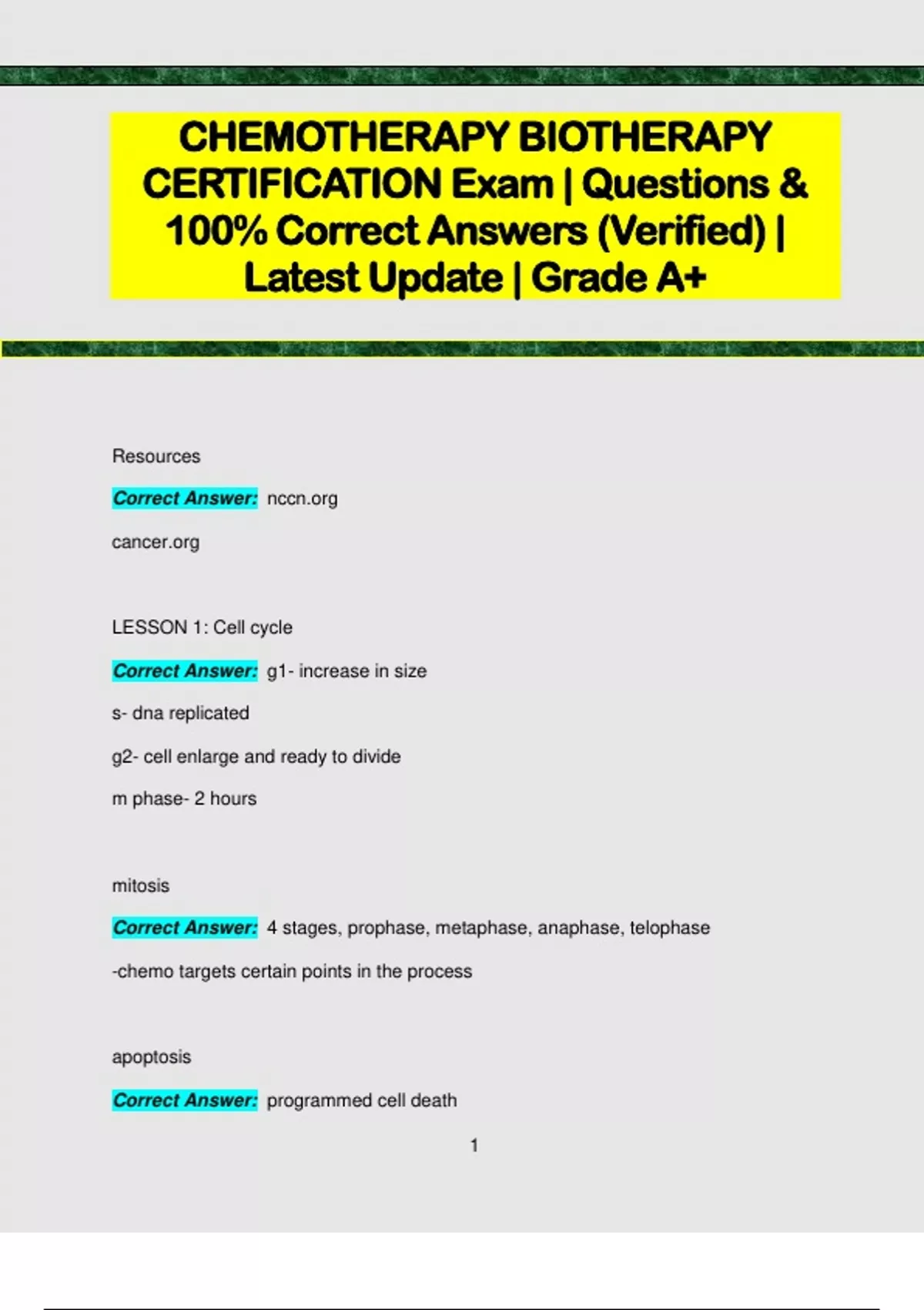 CHEMOTHERAPY BIOTHERAPY CERTIFICATION Exam | Questions & 100% Correct Answers (Verified) | Latest Update | Grade A+