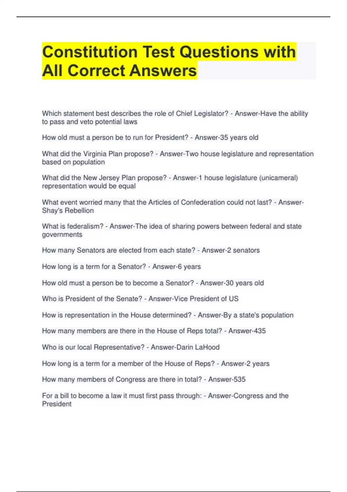 Constitution Test Questions with All Correct Answers Which statement best describes the role of Chief Legislator? - Answer-Have the ability to pass and veto potential laws How old must a person be to run for President? - Answer-35 years old What did the Virginia Plan propose? - Answer-Two house legislature and representation based on population What did the New Jersey Plan propose? - Answer-1 house legislature (unicameral) representation would be equal What event worried many that the Articles of Confederation could not last? - AnswerShay's Rebellion What is federalism? - Answer-The idea of sharing powers between federal and state governments How many Senators are elected from each state? - Answer-2 senators How long is a term for a Senator? - Answer-6 years How old must a person be to become a Senator? - Answer-30 years old