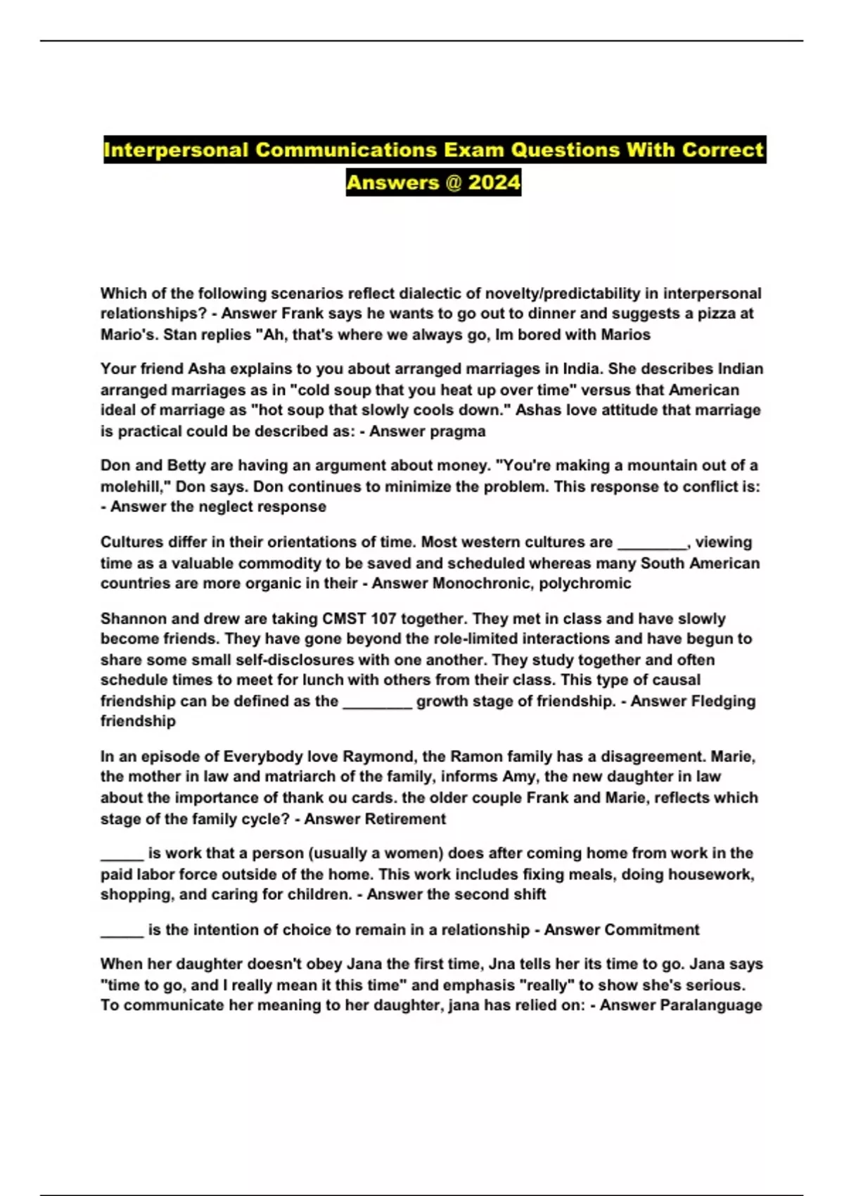 Interpersonal Communications Exam Questions With Correct Answers @ 2024...
