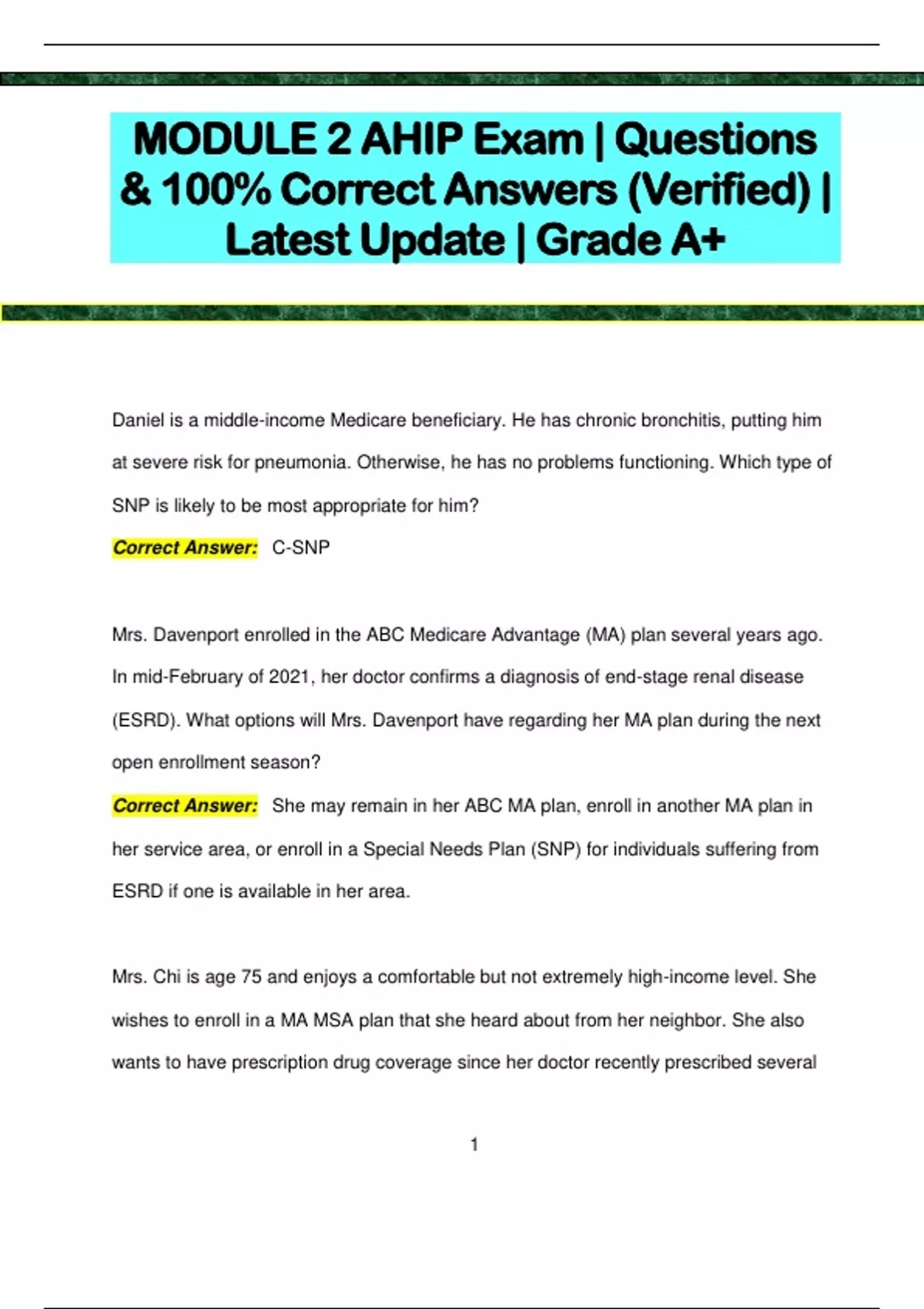 Daniel is a middle-income Medicare beneficiary. He has chronic bronchitis, putting him at severe risk for pneumonia. Otherwise, he has no problems functioning. Which type of SNP is likely to be most appropriate for him? Correct Answer: C-SNP Mrs. Davenport enrolled in the ABC Medicare Advantage (MA) plan several years ago. In mid-February of 2021, her doctor confirms a diagnosis of end-stage renal disease (ESRD). What options will Mrs. Davenport have regarding her MA plan during the next open enrollment season? Correct Answer: She may remain in her ABC MA plan, enroll in another MA plan in her service area, or enroll in a Special Needs Plan (SNP) for individuals suffering from ESRD if one is available in her area. Mrs. Chi is age 75 and enjoys a comfortable but not extremely high-income level. She wishes to enroll in a MA MSA plan that she heard about from her neighbor. She also wants to have prescription drug coverage since her doctor recently prescribed several 2 expensive medications. Currently, she is enrolled in Original Medicare and a standalone Part D plan. How would you advise Mrs. Chi? Correct Answer: Mrs. Chi may enroll in a MA MSA plan and remain in her current standalone Part D prescription drug plan. Mr. Kumar is considering a Medicare Advantage HMO and has questions about his ability to access providers. What should you tell him? Correct Answer: In most Medicare Advantage HMOs, Mr. Kumar must generally obtain his services only from providers within the plan's network (except in an emergency or where care is unavailable within the network). Mr. Sinclair has diabetes and heart trouble and is generally satisfied with the care he has received under Original Medicare, but he would like to know more about Medicare Advantage Special Needs Plans (SNPs). What could you tell him? Correct Answer: SNPs have special programs for enrollees with chronic conditions, like Mr. Sinclair, and they provide prescription drug coverage that could be very helpful as well. Mr. Castillo, a naturalized citizen, previously enrolled in Medicare Part B but has recently stopped paying his Part B premium. Mr. Castillo is still covered by Part A. He would like to enroll in a Medicare Advantage (MA) plan and is still covered by Part A. What should you tell him? 3 Correct Answer: He is not eligible to enroll in a Medicare Advantage plan until he reenrolls in Medicare Part B. Mr. Lombardi is interested in a Medicare Advantage (MA) PPO plan that you represent. It is one of three plans operated by the same organization in Mr. Lombardi's area. The MA PPO plan does not include drug coverage, but the other two plans do. Mr. Lombardi likes the PPO plan that does not include drug coverage and intends to obtain his drug coverage through a stand-alone Medicare prescription drug plan. What should you tell him about this situation