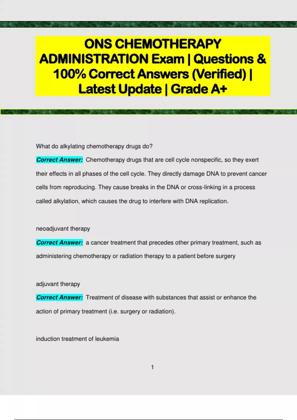 ONS CHEMOTHERAPY ADMINISTRATION Exam | Questions & 100% Correct Answers (Verified) | Latest Update | Grade A+