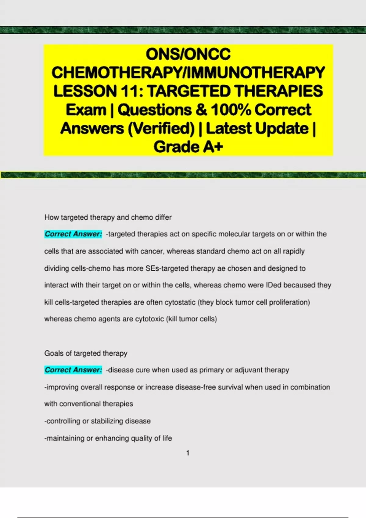 ONS/ONCC CHEMOTHERAPY/IMMUNOTHERAPY LESSON 11: TARGETED THERAPIES Exam | Questions & 100% Correct Answers (Verified) | Latest Update | Grade A+