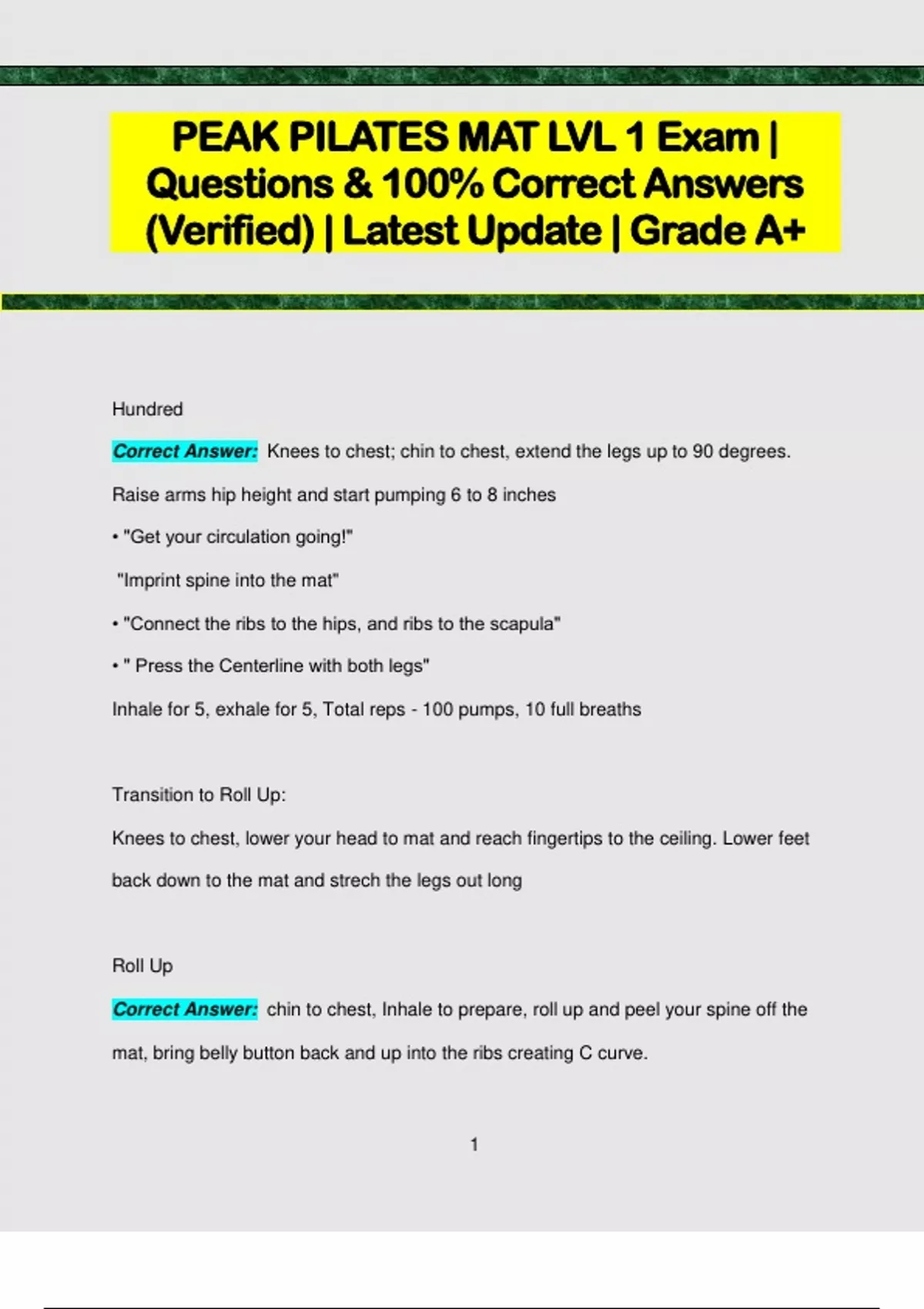 PEAK PILATES MAT LVL 1 Exam | Questions & 100% Correct Answers (Verified) | Latest Update | Grade A+