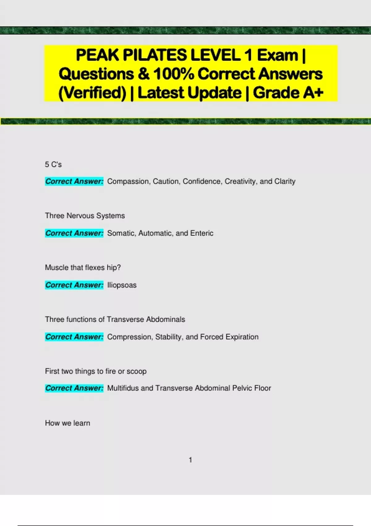 PEAK PILATES LEVEL 1 Exam | Questions & 100% Correct Answers (Verified) | Latest Update | Grade A+