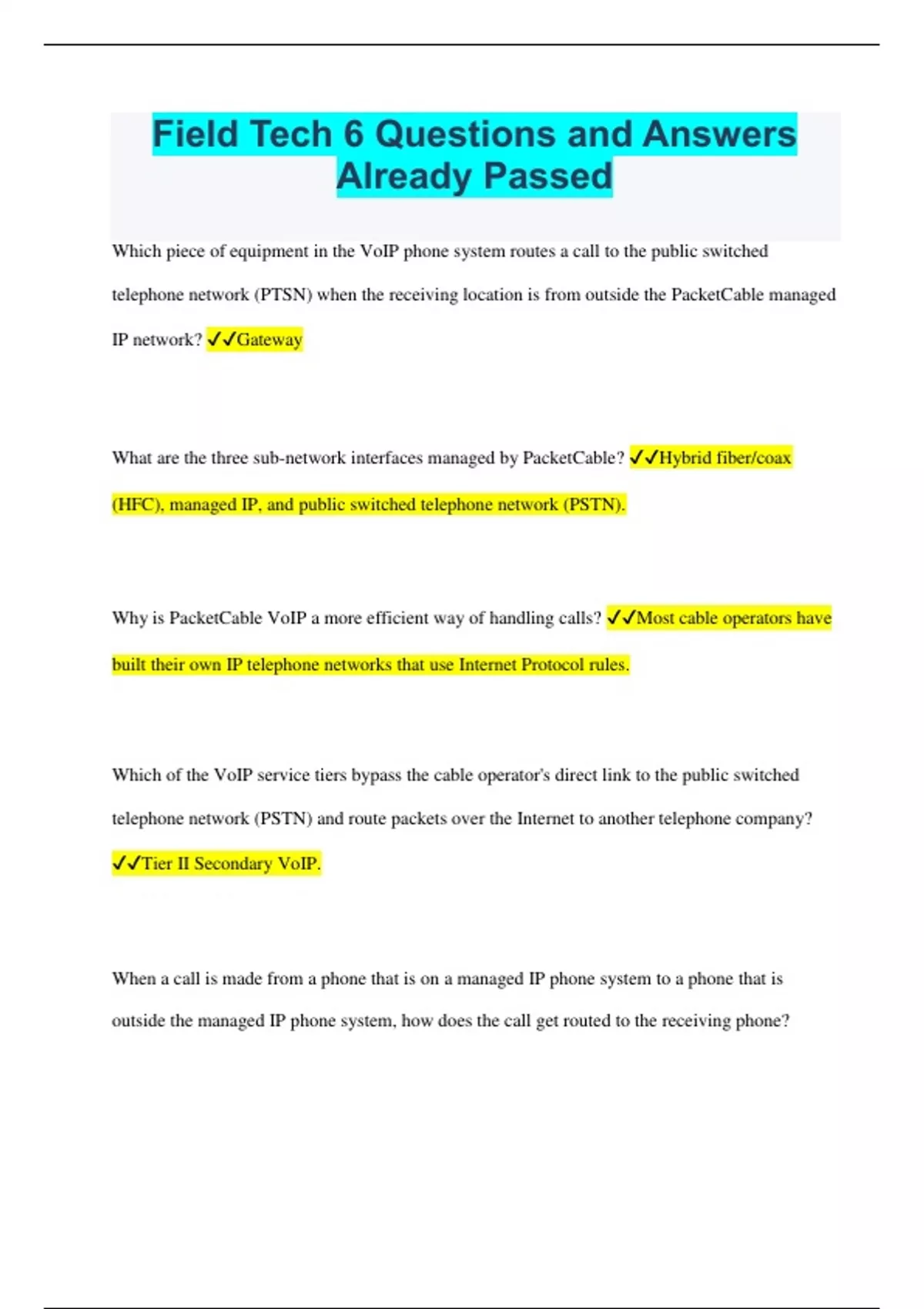 Field Tech 6 Questions and Answers Already Passed Which piece of equipment in the VoIP phone system routes a call to the public switched telephone network (PTSN) when the receiving location is from outside the PacketCable managed IP network? Gateway What are the three sub-network interfaces managed by PacketCable? Hybrid fiber/coax (HFC), managed IP, and public switched telephone network (PSTN). Why is PacketCable VoIP a more efficient way of handling calls? Most cable operators have built their own IP telephone networks that use Internet Protocol rules. Which of the VoIP service tiers bypass the cable operator's direct link to the public switched telephone network (PSTN) and route packets over the Internet to another telephone company? Tier II Secondary VoIP. When a call is made from a phone that is on a managed IP phone system to a phone that is outside the managed IP phone system, how does the call get routed to the receiving phone?