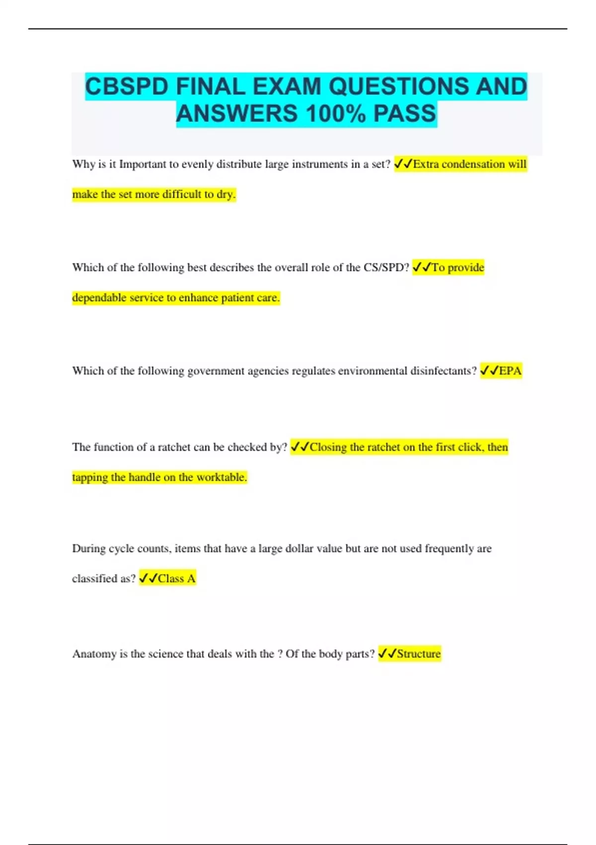 CBSPD FINAL EXAM QUESTIONS AND ANSWERS 100% PASS Why is it Important to evenly distribute large instruments in a set? Extra condensation will make the set more difficult to dry. Which of the following best describes the overall role of the CS/SPD? To provide dependable service to enhance patient care. Which of the following government agencies regulates environmental disinfectants? EPA The function of a ratchet can be checked by? Closing the ratchet on the first click, then tapping the handle on the worktable. During cycle counts, items that have a large dollar value but are not used frequently are classified as? Class A Anatomy is the science that deals with the ? Of the body parts? Structure