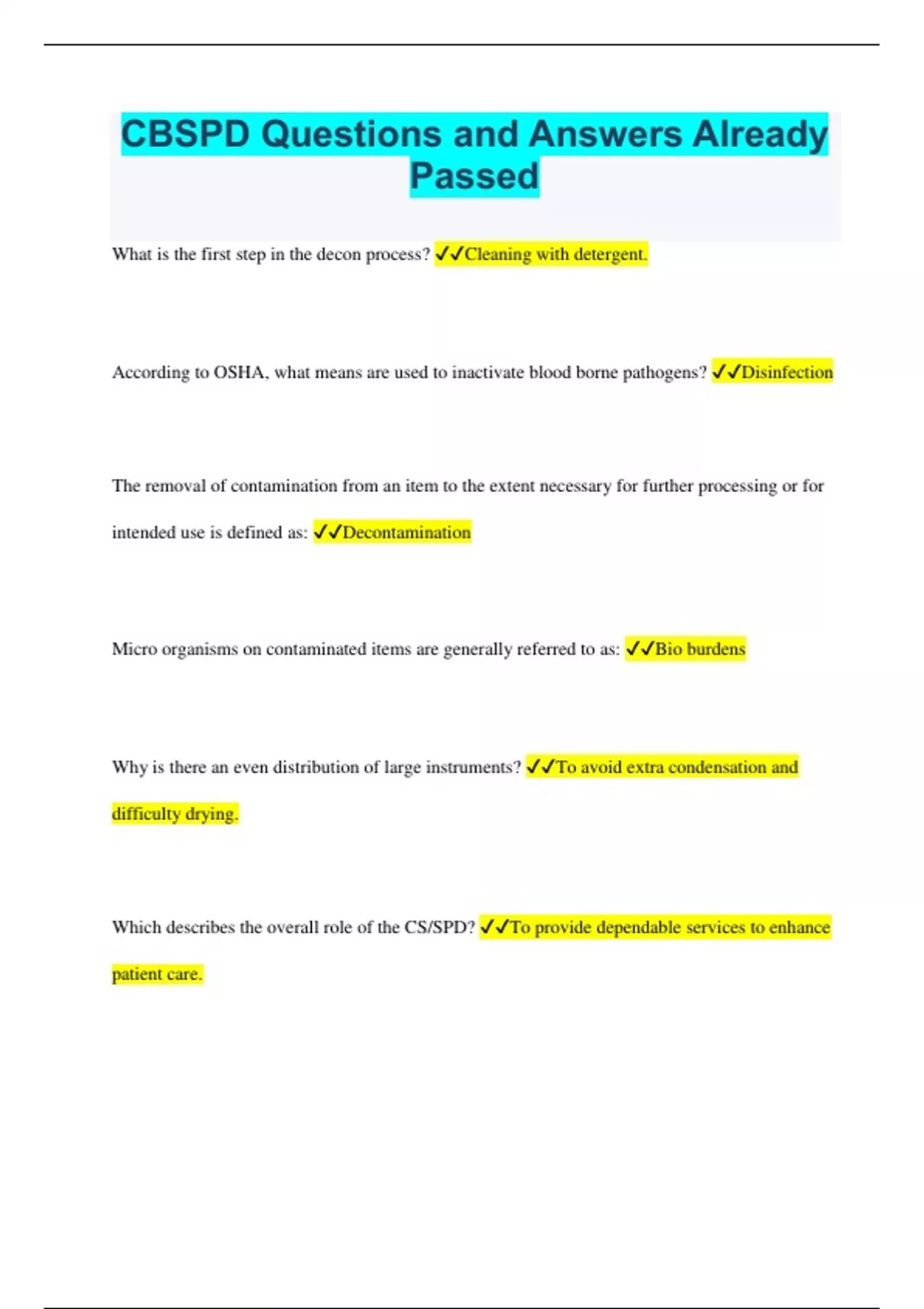 CBSPD Questions and Answers Already Passed What is the first step in the decon process? Cleaning with detergent. According to OSHA, what means are used to inactivate blood borne pathogens? Disinfection The removal of contamination from an item to the extent necessary for further processing or for intended use is defined as: Decontamination Micro organisms on contaminated items are generally referred to as: Bio burdens Why is there an even distribution of large instruments? To avoid extra condensation and difficulty drying. Which describes the overall role of the CS/SPD? To provide dependable services to enhance patient care.