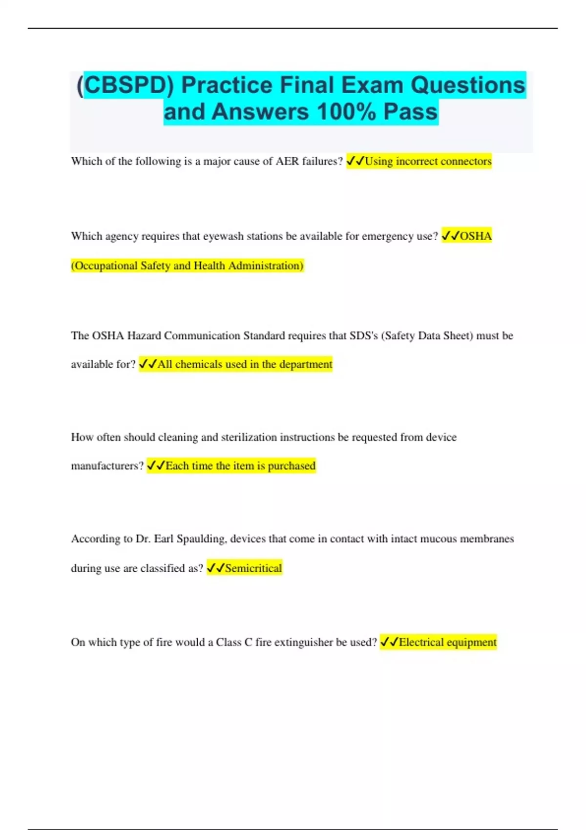 (CBSPD) Practice Final Exam Questions and Answers 100% Pass Which of the following is a major cause of AER failures? Using incorrect connectors Which agency requires that eyewash stations be available for emergency use? OSHA (Occupational Safety and Health Administration) The OSHA Hazard Communication Standard requires that SDS's (Safety Data Sheet) must be available for? All chemicals used in the department How often should cleaning and sterilization instructions be requested from device manufacturers? Each time the item is purchased According to Dr. Earl Spaulding, devices that come in contact with intact mucous membranes during use are classified as? Semicritical On which type of fire would a Class C fire extinguisher be used? Electrical equipment