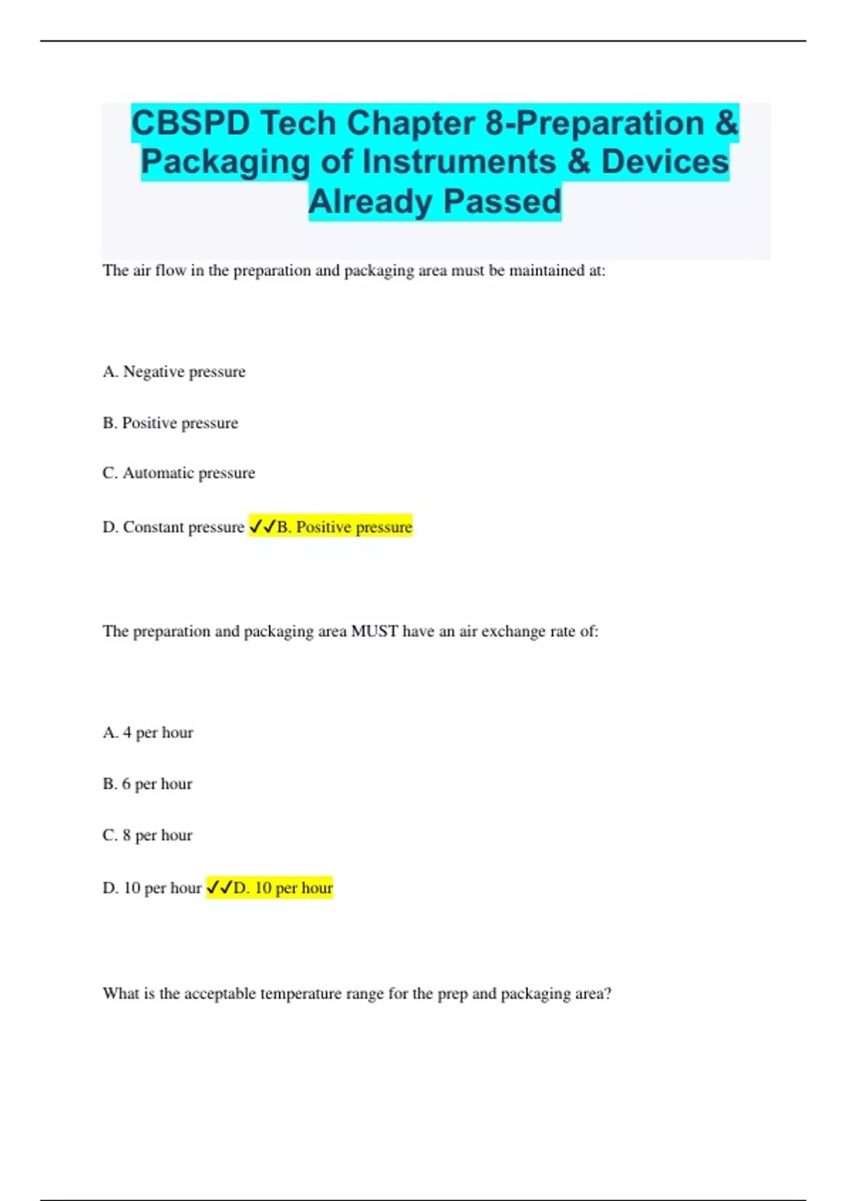 CBSPD Tech Chapter 8-Preparation & Packaging of Instruments & Devices Already Passed The air flow in the preparation and packaging area must be maintained at: A. Negative pressure B. Positive pressure C. Automatic pressure D. Constant pressure B. Positive pressure The preparation and packaging area MUST have an air exchange rate of: A. 4 per hour B. 6 per hour C. 8 per hour D. 10 per hour D. 10 per hour