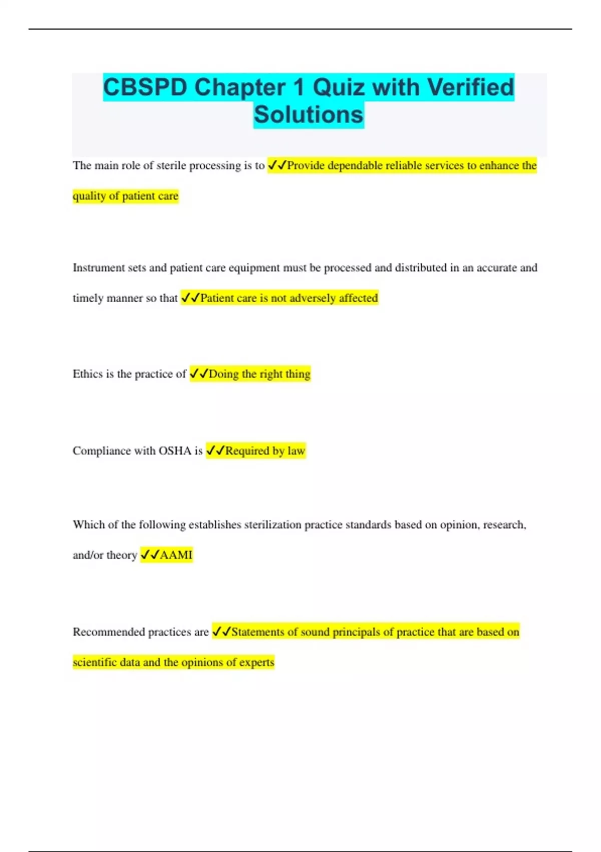 CBSPD Chapter 1 Quiz with Verified Solutions The main role of sterile processing is to Provide dependable reliable services to enhance the quality of patient care Instrument sets and patient care equipment must be processed and distributed in an accurate and timely manner so that Patient care is not adversely affected Ethics is the practice of Doing the right thing Compliance with OSHA is Required by law Which of the following establishes sterilization practice standards based on opinion, research, and/or theory AAMI Recommended practices are Statements of sound principals of practice that are based on scientific data and the opinions of experts