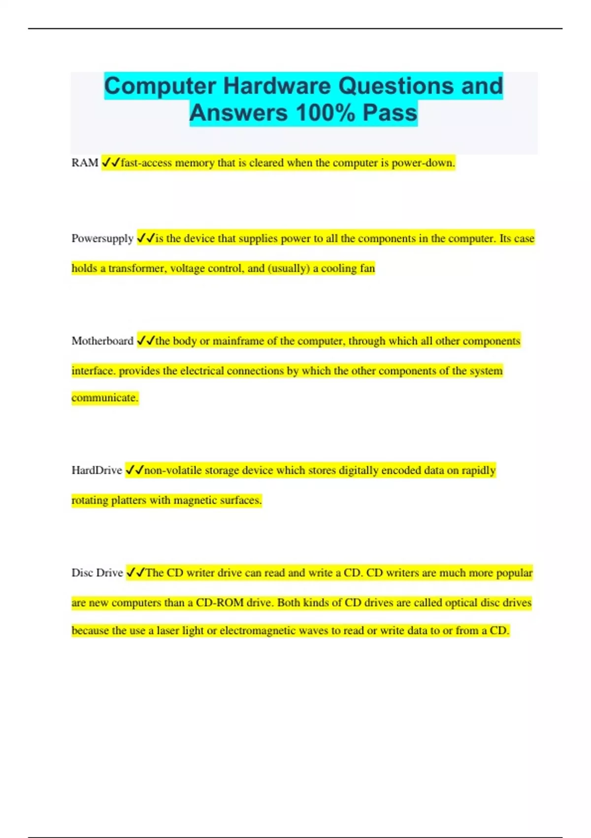 Computer Hardware Questions and Answers 100% Pass RAM fast-access memory that is cleared when the computer is power-down. Powersupply is the device that supplies power to all the components in the computer. Its case holds a transformer, voltage control, and (usually) a cooling fan Motherboard the body or mainframe of the computer, through which all other components interface. provides the electrical connections by which the other components of the system communicate. HardDrive non-volatile storage device which stores digitally encoded data on rapidly rotating platters with magnetic surfaces. Disc Drive The CD writer drive can read and write a CD. CD writers are much more popular are new computers than a CD-ROM drive. Both kinds of CD drives are called optical disc drives because the use a laser light or electromagnetic waves to read or write data to or from a CD.