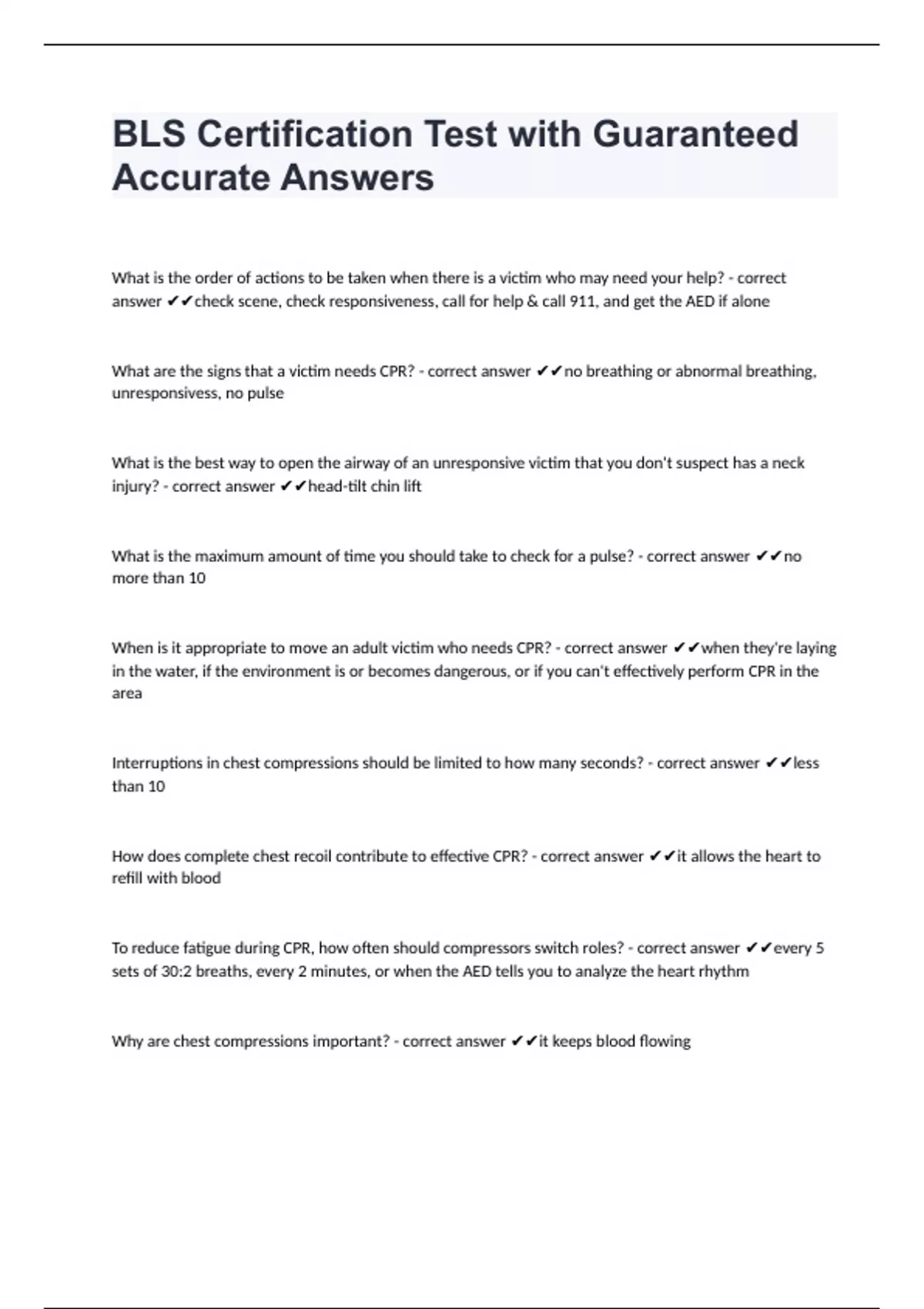 What is the order of actions to be taken when there is a victim who may need your help? - correct answer check scene, check responsiveness, call for help & call 911, and get the AED if alone What are the signs that a victim needs CPR? - correct answer no breathing or abnormal breathing, unresponsivess, no pulse What is the best way to open the airway of an unresponsive victim that you don't suspect has a neck injury? - correct answer head-tilt chin lift What is the maximum amount of time you should take to check for a pulse? - correct answer no more than 10 When is it appropriate to move an adult victim who needs CPR? - correct answer when they're laying in the water, if the environment is or becomes dangerous, or if you can't effectively perform CPR in the area Interruptions in chest compressions should be limited to how many seconds? - correct answer less than 10 How does complete chest recoil contribute to effective CPR? - correct answer it allows the heart to refill with