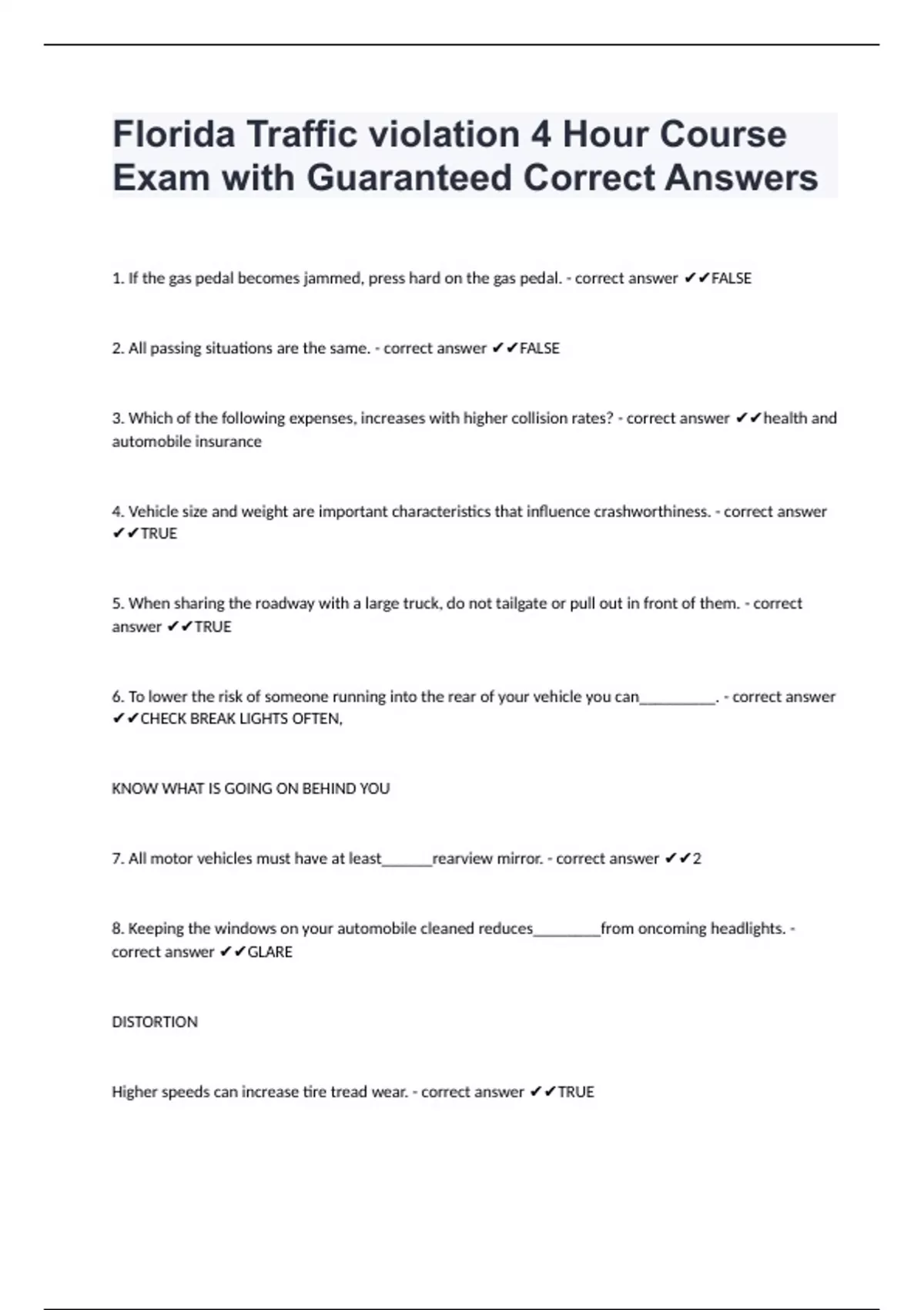 Florida Traffic violation 4 Hour Course Exam with Guaranteed Correct Answers