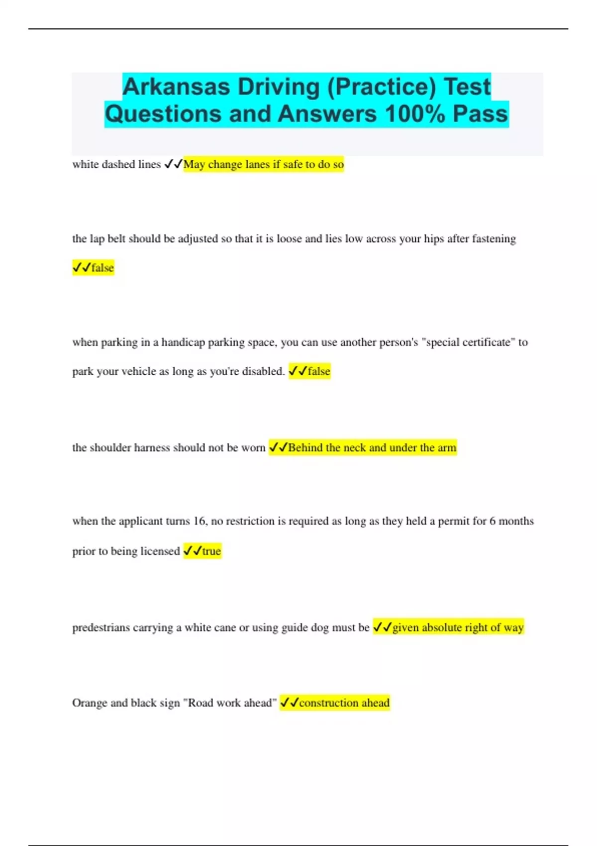 Arkansas Driving (Practice) Test Questions and Answers 100% Pass white dashed lines May change lanes if safe to do so the lap belt should be adjusted so that it is loose and lies low across your hips after fastening false when parking in a handicap parking space, you can use another person's "special certificate" to park your vehicle as long as you're disabled. false the shoulder harness should not be worn Behind the neck and under the arm when the applicant turns 16, no restriction is required as long as they held a permit for 6 months prior to being licensed true predestrians carrying a white cane or using guide dog must be given absolute right of way Orange and black sign "Road work ahead" construction ahead
