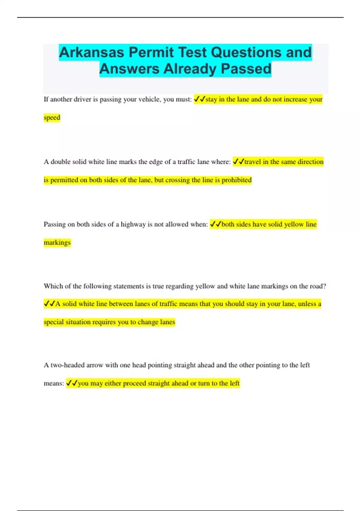 Arkansas Permit Test Questions and Answers Already Passed If another driver is passing your vehicle, you must: stay in the lane and do not increase your speed A double solid white line marks the edge of a traffic lane where: travel in the same direction is permitted on both sides of the lane, but crossing the line is prohibited Passing on both sides of a highway is not allowed when: both sides have solid yellow line markings Which of the following statements is true regarding yellow and white lane markings on the road? A solid white line between lanes of traffic means that you should stay in your lane, unless a special situation requires you to change lanes A two-headed arrow with one head pointing straight ahead and the other pointing to the left means: you may either proceed straight ahead or turn to the left