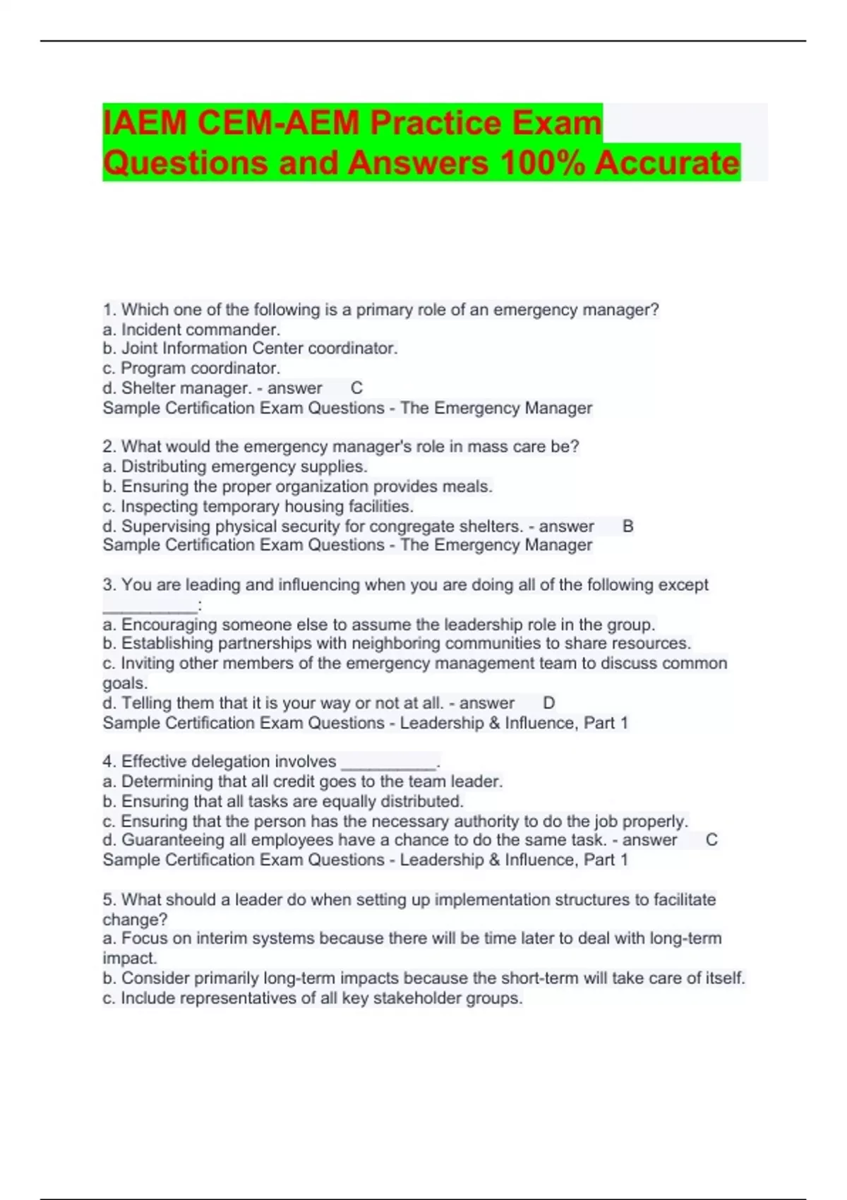 IAEM CEM-AEM Practice Exam Questions and Answers 100% Accurate 1. Which one of the following is a primary role of an emergency manager? a. Incident commander. b. Joint Information Center coordinator. c. Program coordinator. d. Shelter manager. C Sample Certification Exam Questions - The Emergency Manager 2. What would the emergency manager's role in mass care be? a. Distributing emergency supplies. b. Ensuring the proper organization provides meals. c. Inspecting temporary housing facilities. d. Supervising physical security for congregate shelters. B Sample Certification Exam Questions - The Emergency Manager 3. You are leading and influencing when you are doing all of the following except __________: a. Encouraging someone else to assume the leadership role in the group. b. Establishing partnerships with neighboring communities to share resources. c. Inviting other members of the emergency management team to discuss common goals. d. Telling them that it is your way or not at all. D Sample Certification Exam Questions - Leadership & Influence, Part 1 4. Effective delegation involves __________. a. Determining that all credit goes to the team leader. b. Ensuring that all tasks are equally distributed. c. Ensuring that the person has the necessary authority to do the job properly. d. Guaranteeing all employees have a chance to do the same task. C Sample Certification Exam Questions - Leadership & Influence, Part 1 5. What should a leader do when setting up implementation structures to facilitate change? a. Focus on interim systems because there will be time later to deal with long-term impact. b. Consider primarily long-term impacts because the short-term will take care of itself. c. Include representatives of all key stakeholder groups. d. Place the greatest emphasis on how the change will impact the highest levels of management. C Sample Certification Exam Questions - Leadership & Influence, Part 2 6. During times of change, it is important for leaders to ____________: a. Make sure that they put the right spin on the situation, especially when things are going badly. b. Discourage stakeholders from expressing their misgivings. c. Explain the situation once, then move on - don't dwell on it. d. Communicate first through actions, then words. D Sample Certification Exam Questions - Leadership & Influence, Part 2 7. Airing your concerns about taking on a new commitment is likely to: a. Build trust. b. Erode trust. c. Expand your capacity to trust. d. Reduce your responsibility but enhance your authority. A Sample Certification Exam Questions - Leadership & Influence, Part 3 8. Demonstrating conviction, courage, compassion, and community can: a. Be used by a transformational leader to build trust. b. Diminish your capacity for trusting others. c. Make you vulnerable to your adversaries. d. Undermine or erode trust. A Sample Certification Exam Questions - Leadership & Influence, Part 3 9. The emergency manager's role for media relations is to: (a.) Ensure plans for this function are in place and up-to-date. (b.) Make all contacts with the media. (c.) Review and approve all releases. (d.) Serve as the primary spokesperson. A Sample Certification Exam Questions - Program Management, Part 1 10. If the community already has an emergency operations plan, the emergency manager should: (a.) Assume the plan is probably outdated, and proceed to develop a new one. (b.) Consider this part of the job done, and focus on other activities. (c.) Coordinate a unified effort with all those responsible to keep the plan updated. (d.) Let the people responsible for the various sections decide when and if changes are needed. C Sample Certification Exam Questions - Program Management, Part 1 11. Documentation is a legal and administrative requirement for an emergency management organization. As an emergency manager, you will document which of the following records, except: a. incident records. b. mutual aid activities. c. routine staffing records. d. situation reports. C Sample Certification Exam Questions - Program Management, Part 2 12. Anticipated emergency operations is a budget item consisting of estimates for emergencies that may occur during the budget cycle. What type of data may be needed to support these estimates? a. Emergency operations plan. b. Exercise training plan. c. Historical records. d. Weather reports. C Sample Certification Exam Questions - Program Management, Part 2 13. How is risk defined? a. A predicted impact that a hazard would have on people, services, and specific facilities in a community. b. A specific point of vulnerability. c. The magnitude, duration, seasonal pattern, and speed of onset of a hazard. d. Typical weather patterns for a community. A Sample Certification Exam Questions - Planning, Part 1 14. Frequency, magnitude and potential intensity, and probable spatial extent are all factors to consider when developing a(n): a. Hazard profile. b. Impact estimate. c. Jurisdiction analysis. d. Resource assessment. A Sample Certification Exam Questions - Planning, Part 1 15. Mutual aid and assistance agreements may provide ________ when invoked. a. Change of command b. Unity of command c. Policy decisions d. Equipment such as bulldozers or dump trucks D Sample Certification Exam Questions - Planning, Part 2 16. Standby contracts establish the price as that which is/was in effect: a. on the day before the emergency event. b. on the day of the emergency event. c. on the day after an emergency event. d. do not establish price for the resources provided during an emergency. A Sample Certification Exam Questions - Planning, Part 2 17. Which one of the following objectives is considered short-term? a. The Chamber of Commerce will work with local businesses to implement the economic revitalization strategies developed and approved by the community leaders. b. City departments will work with the whole community to develop permanent housing solutions for people and their families who were left