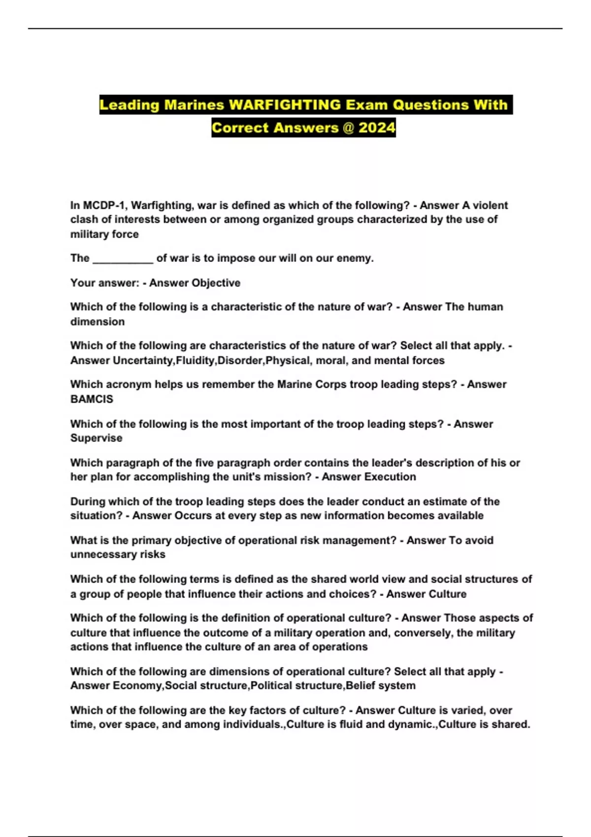 Leading Marines WARFIGHTING Exam Questions With Correct Answers @ 2024