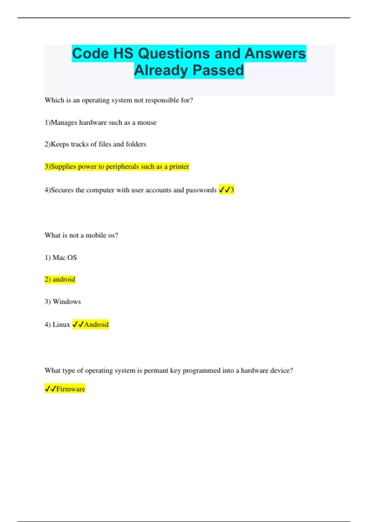 Code HS Questions and Answers Already Passed Which is an operating system not responsible for? 1)Manages hardware such as a mouse 2)Keeps tracks of files and folders 3)Supplies power to peripherals such as a printer 4)Secures the computer with user accounts and passwords 3 What is not a mobile os? 1) Mac OS 2) android 3) Windows 4) Linux Android