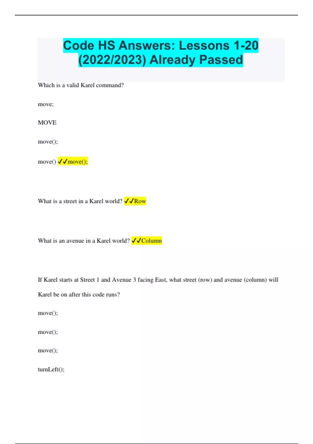 Code HS Answers: Lessons 1-20 (2022/2023) Already Passed Which is a valid Karel command? move; MOVE move(); move() move(); What is a street in a Karel world? Row What is an avenue in a Karel world? Column If Karel starts at Street 1 and Avenue 3 facing East, what street (row) and avenue (column) will Karel be on after this code runs? move(); move(); move(); turnLeft();
