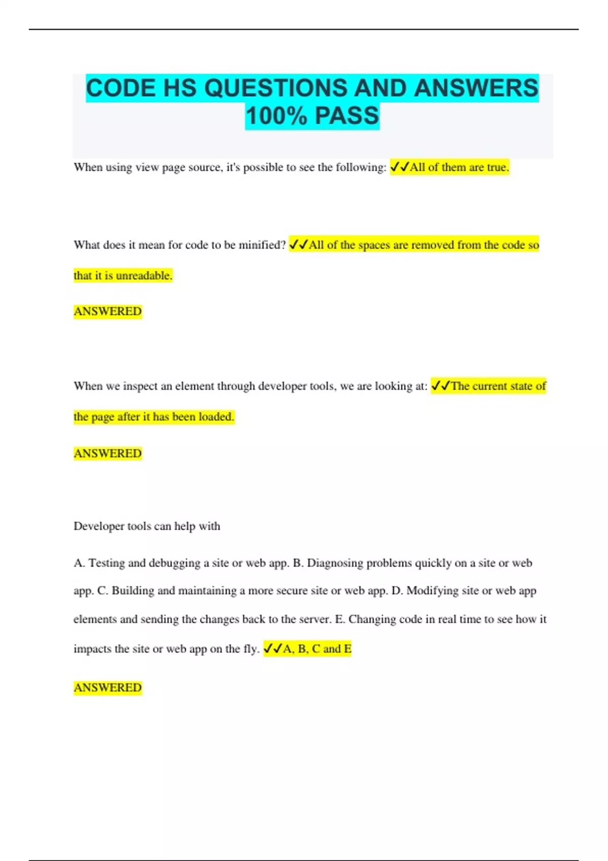 CODE HS QUESTIONS AND ANSWERS 100% PASS When using view page source, it's possible to see the following: All of them are true. What does it mean for code to be minified? All of the spaces are removed from the code so that it is unreadable. ANSWERED When we inspect an element through developer tools, we are looking at: The current state of the page after it has been loaded. ANSWERED Developer tools can help with A. Testing and debugging a site or web app. B. Diagnosing problems quickly on a site or web app. C. Building and maintaining a more secure site or web app. D. Modifying site or web app elements and sending the changes back to the server. E. Changing code in real time to see how it impacts the site or web app on the fly. A, B, C and E ANSWERED
