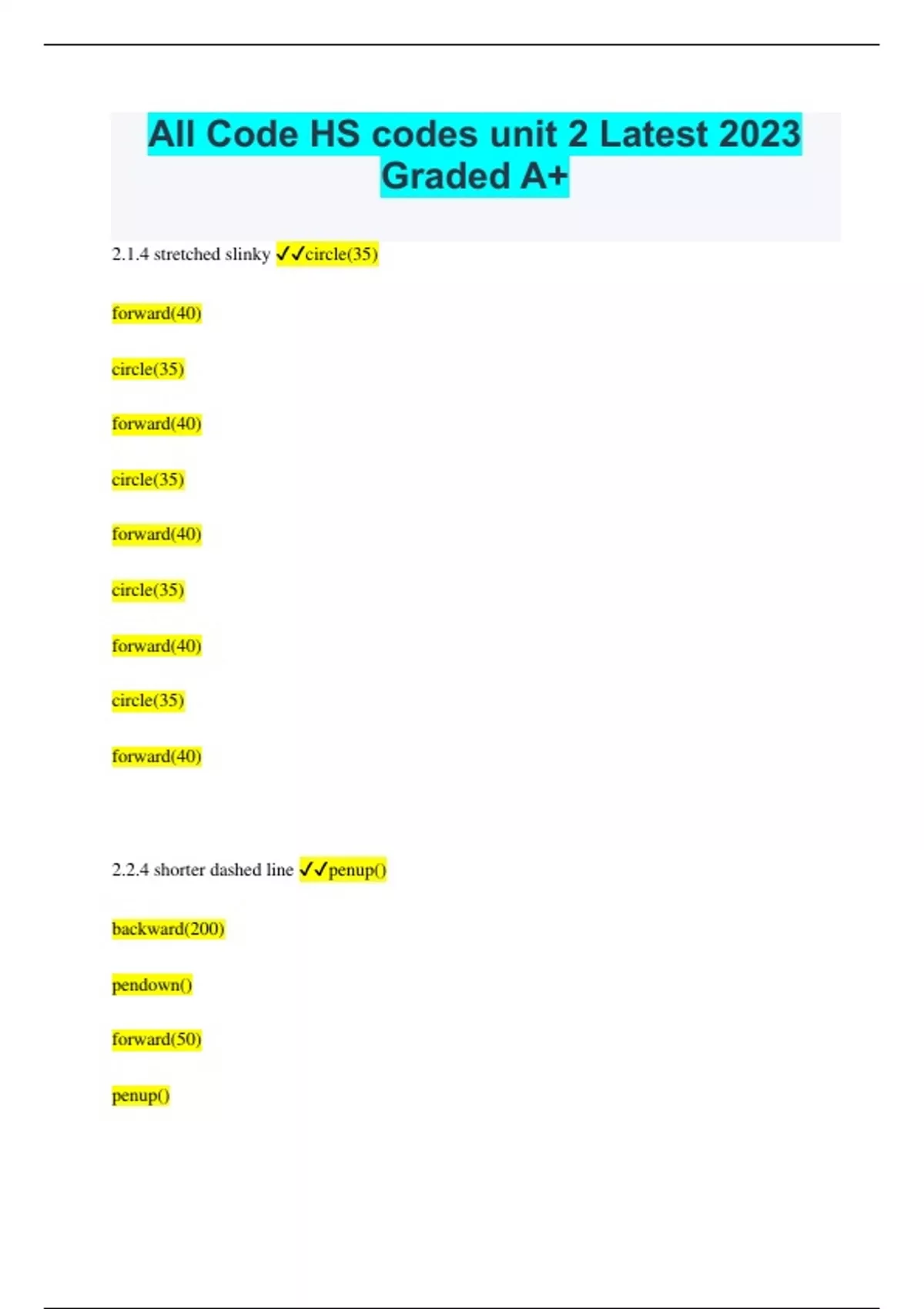 All Code HS codes unit 2 Latest 2023 Graded A+ 2.1.4 stretched slinky circle(35) forward(40) circle(35) forward(40) circle(35) forward(40) circle(35) forward(40) circle(35) forward(40) 2.2.4 shorter dashed line penup() backward(200) pendown() forward(50) penup()