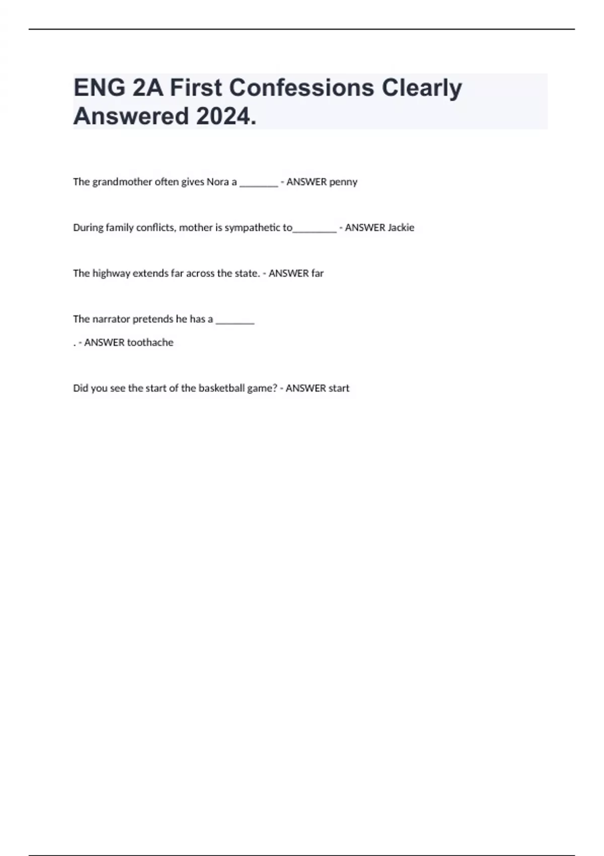 ENG 2A First Confessions Clearly Answered 2024.The grandmother often gives Nora a _______ - ANSWER penny During family conflicts, mother is sympathetic to________ - ANSWER Jackie