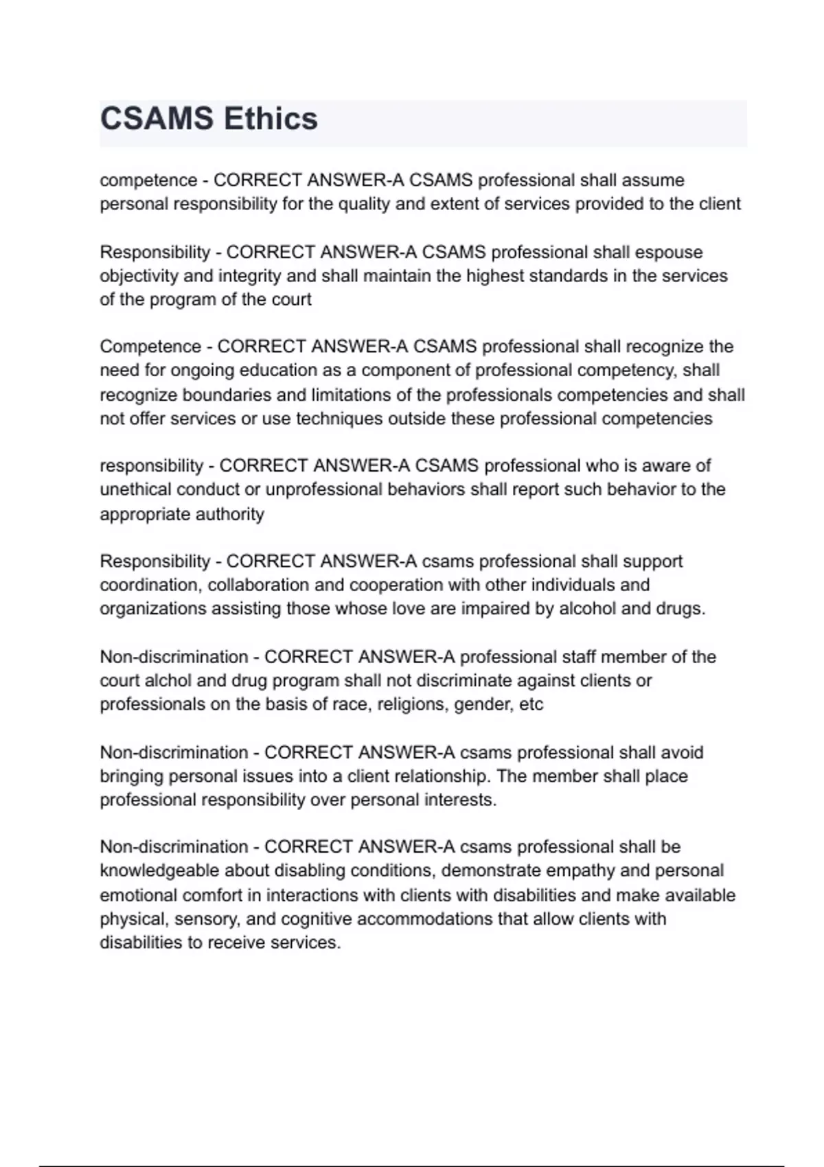 competence - CORRECT ANSWER-A CSAMS professional shall assume personal responsibility for the quality and extent of services provided to the client Responsibility - CORRECT ANSWER-A CSAMS professional shall espouse objectivity and integrity and shall maintain the highest standards in the services of the program of the court Competence - CORRECT ANSWER-A CSAMS professional shall recognize the need for ongoing education as a component of professional competency, shall recognize boundaries and limitations of the professionals competencies and shall not offer services or use techniques outside these professional competencies responsibility - CORRECT ANSWER-A CSAMS professional who is aware of unethical conduct or unprofessional behaviors shall report such behavior to the appropriate authority Responsibility - CORRECT ANSWER-A csams professional shall support coordination, collaboration and cooperation with other individuals and organizations assisting those whose love are impaired by alcohol and drugs. Non-discrimination - CORRECT ANSWER-A professional staff member of the court alchol and drug program shall not discriminate against clients or professionals on the basis of race, religions, gender, etc Non-discrimination - CORRECT ANSWER-A csams professional shall avoid bringing personal issues into a client relationship. The member shall place professional responsibility over personal interests. Non-discrimination - CORRECT ANSWER-A csams professional shall be knowledgeable about disabling conditions, demonstrate empathy and personal emotional comfort in interactions with clients with disabilities and make available physical, sensory, and cognitive accommodations that allow clients with disabilities to rece