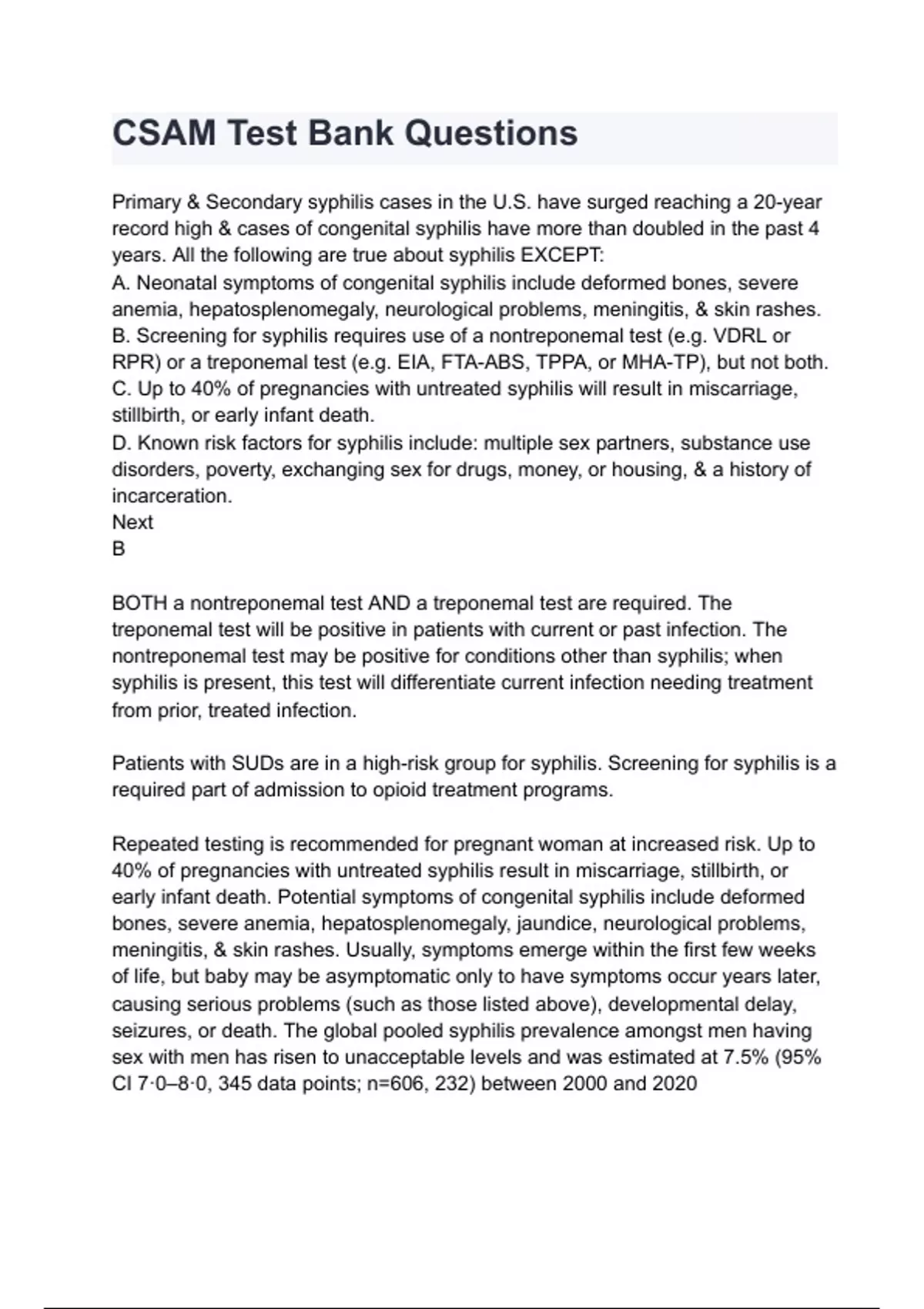 CSAM Test Bank Questions Primary & Secondary syphilis cases in the U.S. have surged reaching a 20-year record high & cases of congenital syphilis have more than doubled in the past 4 years. All the following are true about syphilis EXCEPT: A. Neonatal symptoms of congenital syphilis include deformed bones, severe anemia, hepatosplenomegaly, neurological problems, meningitis, & skin rashes. B. Screening for syphilis requires use of a nontreponemal test (e.g. VDRL or RPR) or a treponemal test (e.g. EIA, FTA-ABS, TPPA, or MHA-TP), but not both. C. Up to 40% of pregnancies with untreated syphilis will result in miscarriage, stillbirth, or early infant death. D. Known risk factors for syphilis include: multiple sex partners, substance use disorders, poverty, exchanging sex for drugs, money, or housing, & a history of incarceration. Next B BOTH a nontreponemal test AND a treponemal test are required. The treponemal test will be positive in patients with current or past infection. The nontreponemal test may be positive for conditions other than syphilis; when syphilis is present, this test will differentiate current infection needing treatment from prior, treated infection. Patients with SUDs are in a high-risk group for syphilis. Screening for syphilis is a required part of admission to opioid treatment programs. Repeated testing is recommended for pregnant woman at increased risk. Up to 40% of pregnancies with untreated syphilis result in miscarriage, stillbirth, or early infant death. Potential symptoms of congenital syphilis include deformed bones, severe anemia, hepatosplenomegaly, jaundice, neurological problems, meningitis, & skin rashes. Usually, symptoms emerge within the first few weeks of life, but baby may be asymptomatic only to have symptoms occur years later, causing serious problems (such as those listed above), developmental delay, seizures, or death. The global pooled syphilis prevalence amongst men having sex with men has risen to unacceptable levels and was estimated at 7.5% (95% CI 7·0–8·0, 345