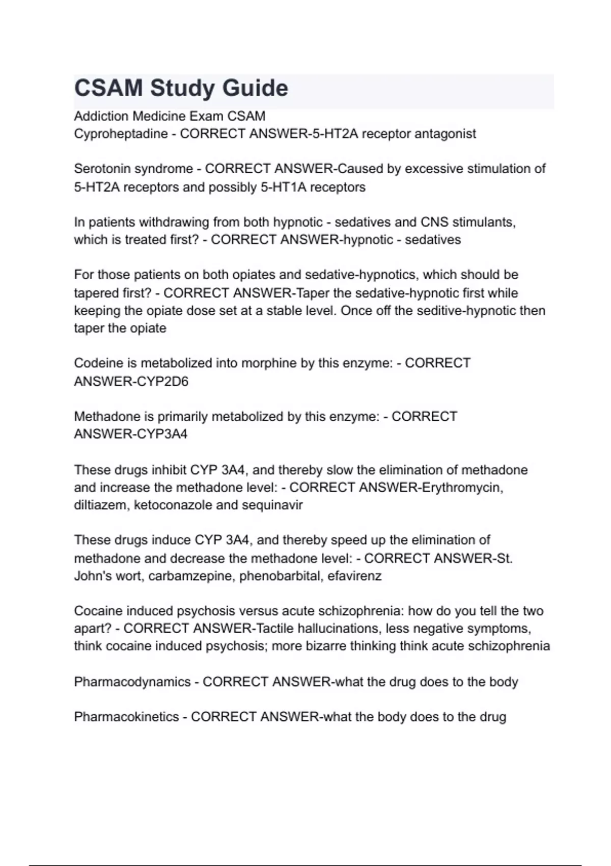 CSAM Study Guide Addiction Medicine Exam CSAM Cyproheptadine - CORRECT ANSWER-5-HT2A receptor antagonist Serotonin syndrome - CORRECT ANSWER-Caused by excessive stimulation of 5-HT2A receptors and possibly 5-HT1A receptors In patients withdrawing from both hypnotic - sedatives and CNS stimulants, which is treated first? - CORRECT ANSWER-hypnotic - sedatives For those patients on both opiates and sedative-hypnotics, which should be tapered first? - CORRECT ANSWER-Taper the sedative-hypnotic first while keeping the opiate dose set at a stable level. Once off the seditive-hypnotic then taper the opiate Codeine is metabolized into morphine by this enzyme: - CORRECT ANSWER-CYP2D6 Methadone is primarily metabolized by this enzyme: - CORRECT ANSWER-CYP3A4 These drugs inhibit CYP 3A4, and thereby slow the elimination of methadone and increase the methadone level: - CORRECT ANSWER-Erythromycin, diltiazem, ketoconazole and sequinavir These drugs induce CYP 3A4, and thereby speed up the elimination of methadone and decrease the methadone level: - CORRECT ANSWER-St. John's wort, carbamzepine, phenobarbital, efavirenz Cocaine induced psychosis versus acute schizophrenia: how do you tell the two apart? - CORRE