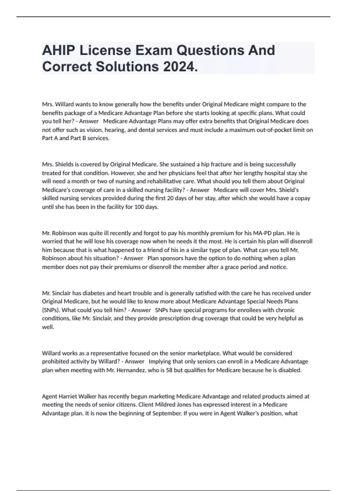 Mrs. Willard wants to know generally how the benefits under Original Medicare might compare to the benefits package of a Medicare Advantage Plan before she starts looking at specific plans. What could you tell her? - Answer Medicare Advantage Plans may offer extra benefits that Original Medicare does not offer such as vision, hearing, and dental services and must include a maximum out-of-pocket limit on Part A and Part B services. Mrs. Shields is covered by Original Medicare. She sustained a hip fracture and is being successfully treated for that condition. However, she and her physicians feel that after her lengthy hospital stay she will need a month or two of nursing and rehabilitative care. What should you tell them about Original Medicare's coverage of care in a skilled nursing facility? - Answer Medicare will cover Mrs. Shield's skilled nursing services provided during the first 20 days of her stay, after which she would have a copay until she has been in the facility for 100 days. Mr. Robinson was quite ill recently and forgot to pay his monthly premium for his MA-PD plan. He is worried that he will lose his coverage now when he needs it the most. He is certain his plan will disenroll him because that is what happened to a friend of his in a similar type of plan. What can you tell Mr. Robinson about his situation? - Answer Plan sponsors have the option to do nothing when a plan member does not pay their premiums or disenroll the member after a grace period and notice. Mr. Sinclair has diabetes and heart trouble and is generally satisfied with the care he has received under Original Medicare, but he would like to know more about Medicare Advantage Special Needs Plans (SNPs). What could you tell him? - Answer SNPs have special programs for enrollees with chronic conditions, like Mr. Sinclair, and they provide prescription drug coverage that could be very helpful as well. Willard works as a representative focused on the senior marketplace. What would be considered prohibited activity by Willard? - Answer Implying that only seniors can enroll in a Medicare Advantage plan when meeting with Mr. Hernandez, who is 58 but qualifies for Medicare because he is disabled. Agent Harriet Walker has recently begun marketing Medicare Advantage and related products aimed at meeting the needs of senior citizens. Client Mildred Jones has expressed interest in a Medicare Advantage plan. It is now the beginning of September. If you were in Agent Walker's position, what