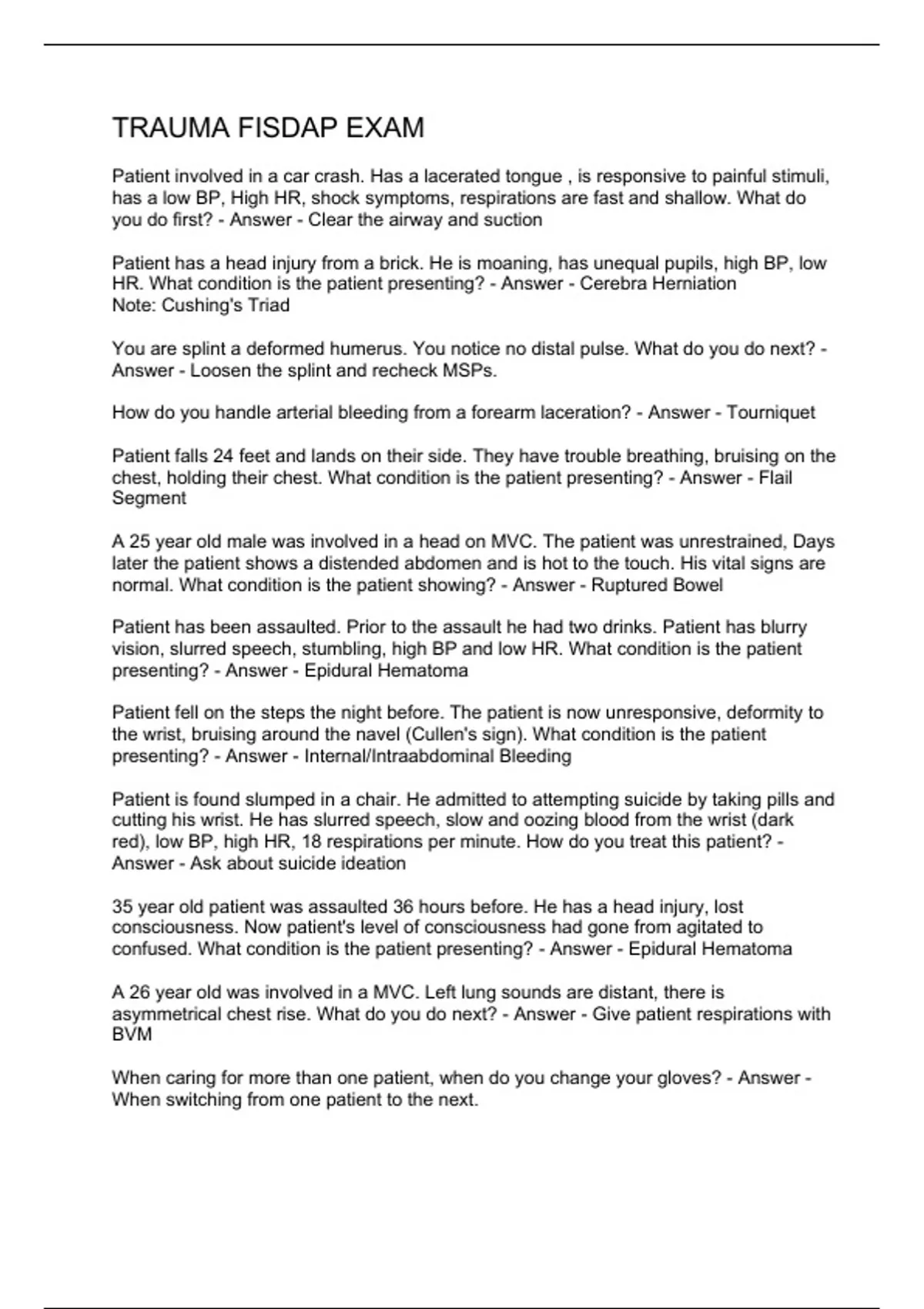 Exam of 6 pages for the course TRAUMA FISDAP at TRAUMA FISDAP (TRAUMA FISDAP EXAM)