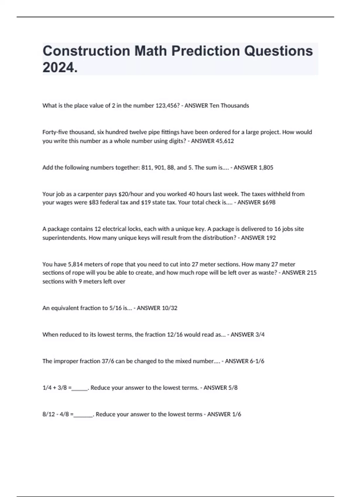 Construction Math Final Exam Prediction Questions 2024. What is the place value of 2 in the number 123,456? - ANSWER Ten Thousands Forty-five thousand, six hundred twelve pipe fittings have been ordered for a large project. How would you write this number as a whole number using digits? - ANSWER 45,612 Add the following numbers together: 811, 901, 88, and 5. The sum is.... - ANSWER 1,805 Your job as a carpenter pays $20/hour and you worked 40 hours last week. The taxes withheld from your wages were $83 federal tax and $19 state tax. Your total check is.... - ANSWER $698 A package contains 12 electrical locks, each with a unique key. A package is delivered to 16 jobs site superintendents. How many unique keys will result from the distribution? - ANSWER 192 You have 5,814 meters of rope that you need to cut into 27 meter sections. How many 27 meter sections of rope will you be able to create, and how much rope will be left over as waste? - ANSWER 215 sections with 9 meters left over An equivalent fraction to 5/16 is... - ANSWER 10/32 When reduced to its lowest terms, the fraction 12/16 would read as... - ANSWER 3/4 The improper fraction 37/6 can be changed to the mixed number.... - ANSWER 6-1/6