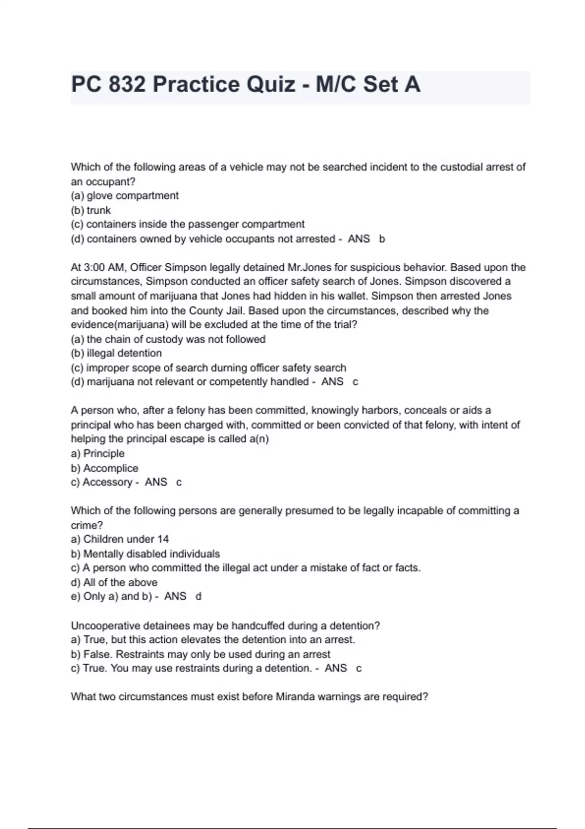 PC 832 Practice Quiz - M/C Set A Exam Questions And Answers Which of the following areas of a vehicle may not be searched incident to the custodial arrest of an occupant? (a) glove compartment (b) trunk (c) containers inside the passenger compartment (d) containers owned by vehicle occupants not arrested - ANS b At 3:00 AM, Officer Simpson legally detained Mr.Jones for suspicious behavior. Based upon the circumstances, Simpson conducted an officer safety search of Jones. Simpson discovered a small amount of marijuana that Jones had hidden in his wallet. Simpson then arrested Jones and booked him into the County Jail. Based upon the circumstances, described why the evidence(marijuana) will be excluded at the time of the trial? (a) the chain of custody was not followed (b) illegal detention (c) improper scope of search durning officer safety search (d) marijuana not relevant or competently handled - ANS c A person who, after a felony has been committed, knowingly harbors, conceals or aids a principal who has been charged with, committed or been convicted of that felony, with intent of helping the principal escape is called a(n) a) Principle b) Accomplice c) Accessory - ANS c Which of the following persons are generally presumed to be legally incapable of committing a crime? a) Children under 14 b) Mentally disabled individuals c) A person who committed the illegal act under a mistake of fact or facts. d) All of the above e) Only a) and b) - ANS d Uncooperative detainees may be handcuffed during a detention? a) True, but this action elevates the detention into an arrest. b) False. Restraints may only be used during an arrest c) True. You may use restraints during a detention. - ANS c