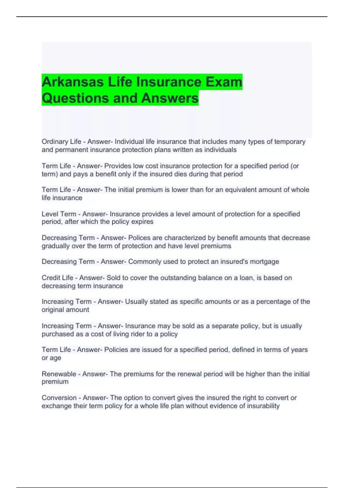 Arkansas Life Insurance Exam Questions and Answers